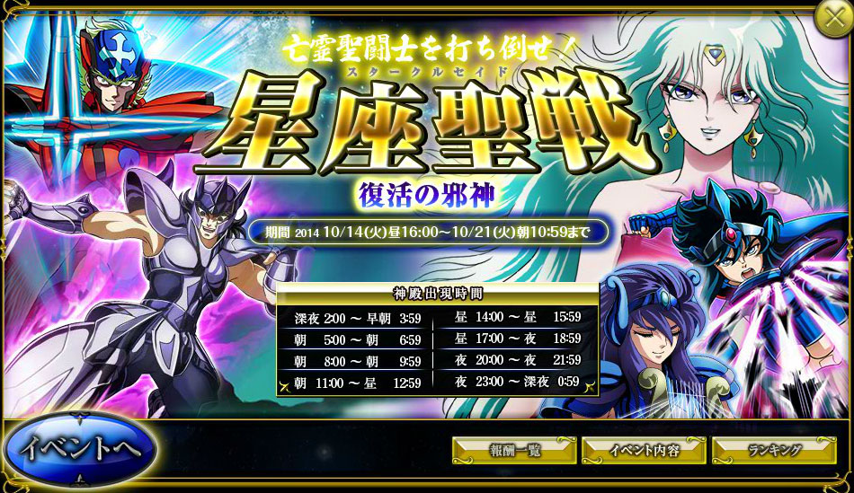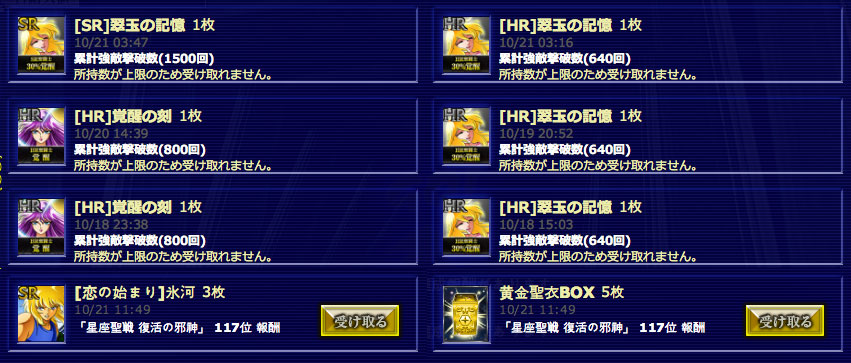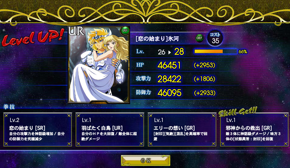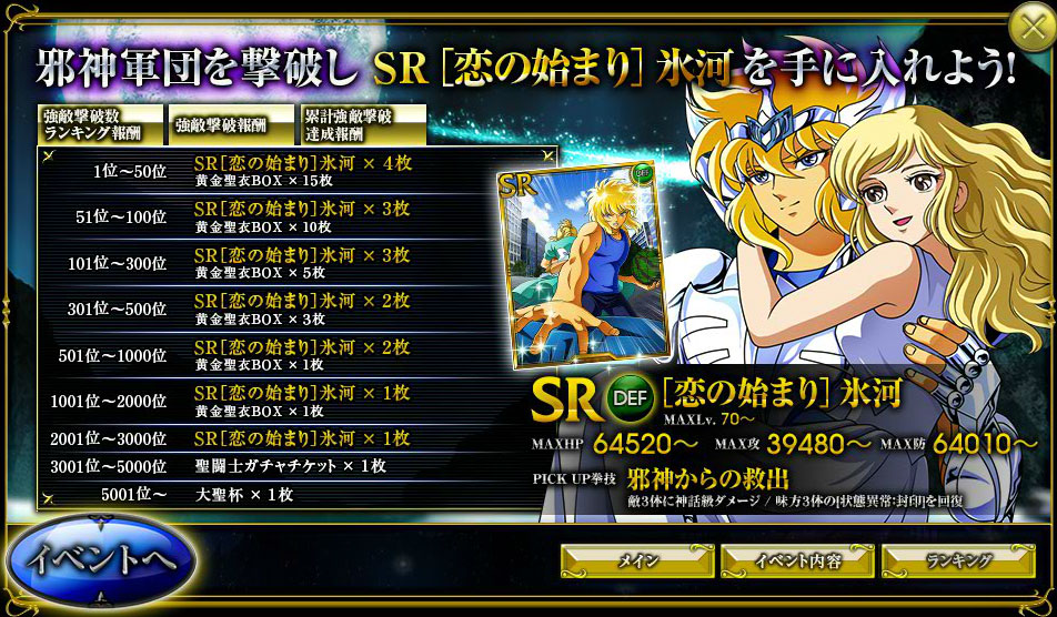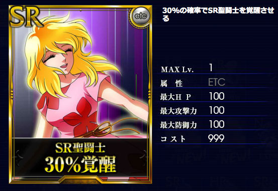 聖闘士星矢 ビッグバンコスモ(13) まだストーリーは白銀聖闘士編だというのに、ポセイドン編のイベントが始まったんだがwやっぱ、夏=海!だからだろうか?いいのか、そんなノリでwwでも丁度、レンタルDVDでポセイドン編観てる時だったから、なんか燃えたねwやっぱ良いなぁ、ポセイドン一家の皆さん♪とりあえず、ドロップで手に入れた海カードたち↓ ソレント最終覚醒。実はHR3枚しか集まらなくて、[HR]翠玉の記憶で最終覚醒させました。ソレントさん、ブレソルのCM見てから結構お気に入りですw バイアン最終覚醒。HRあと2枚余ってるんだけどw イオ最終覚醒。イオさん出過ぎで最終覚醒のSR2枚出来ましたw そして、ジュリアン・ソロ様。残念ながら最終覚醒ならず。まぁ、いつの日か、また [HR]翠玉の記憶 が手に入ったら・・・ そして、こちらがランキング報酬のアイザック!これが欲しかったのよ。だから頑張ったのよ。でも、1枚じゃ覚醒できない=使えないwwwちなみに、鱗衣(スケイル)はまだ登場していませんが・・・白鳥と水瓶が着れちゃうという。流石、氷河の兄弟子。でも最終覚醒してないから使えないのよね(ガクリ [0回]