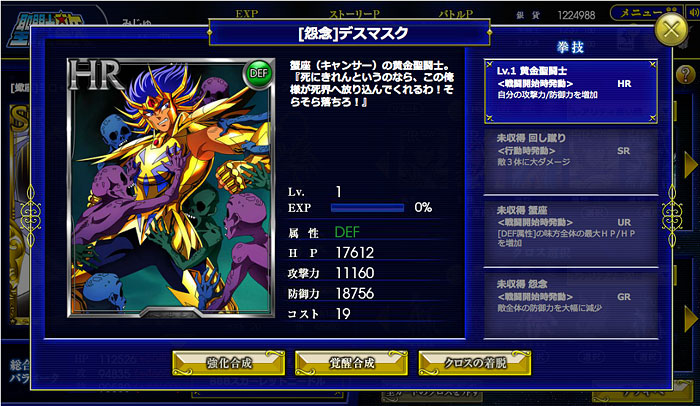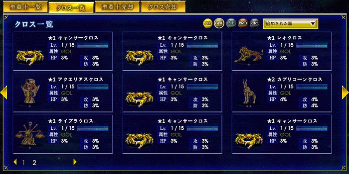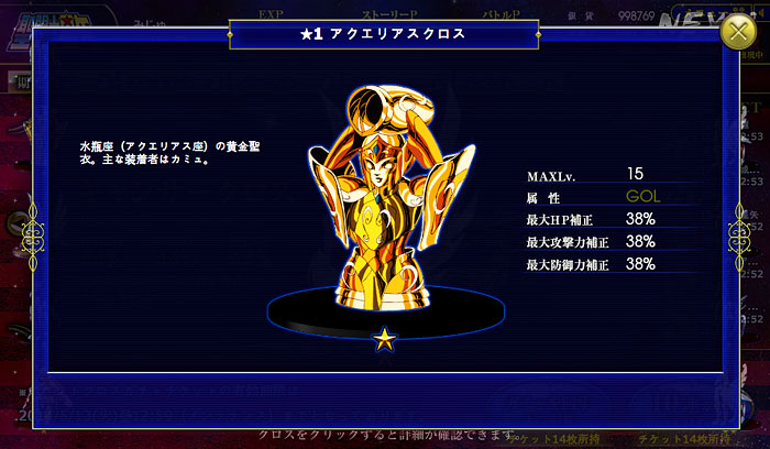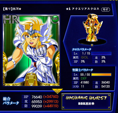 聖闘士星矢 ビッグバンコスモ(4) レベルが上がって、ストーリーP(行動力)もそれなりに上がったから、今では、暇な時だけポチポチやってるんだが、なんか若干飽きて来たw…が、飽きて来た頃にイベントが更新されるという、何気に上手いサイクルになってて、結局やってしまうというwただメンテナンスが多過ぎるよなぁ(暇な時に限ってメンテになるんだ・苦笑)カードは、モバ星の絵柄使い回し=美麗絵だから不満は無いんだけどね。***前回のイベントは黄金聖衣を手に入れる大チャンス!ってことで、軍メンさん&戦友さんの力もあって、ガチャチケ大量にゲットできました。ありがとうございました。m(_ _)m おかげさまで、念願のアクエリアス聖衣をゲット!早速、氷河に装着させました♪(HRしかないのが残念・・・) 他にも、いろいろゲットして黄金聖衣増えたんですが・・・ 蟹、多過ぎじゃね?ww 合成して強化しても、未覚醒のHRデッちゃんしか持ってないのでした(トホホ [0回]PR