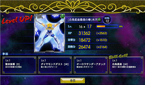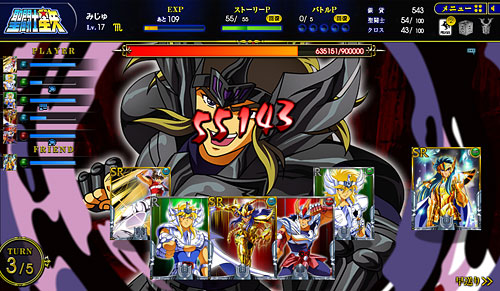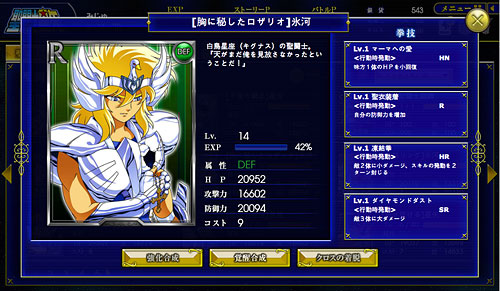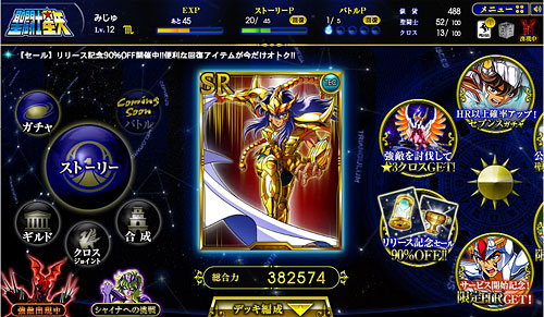 聖闘士星矢 ビッグバンコスモ 配信開始 あの名作アニメの新作ゲームが登場!Yahoo! Mobageで『聖闘士星矢 ビッグバンコスモ』配信開始http://www.4gamer.net/games/251/G025131/20140401052/ってことで、早速プレイしてますwブラウザゲームって、殆どやったことないんだけど、演出とか凄く凝ってるのね。スタート画面とかログインボーナスとか、ちょっとだけ喋ってくれる(CV.二代目) 最初に自分の星座(=カード)を選べと言われるので、何の迷いもなく、この方を選択。つくづく蠍座で良かったと思うw このゲームの特徴は、カードの他にクロスがあって・・・ カードにクロスを装着させて強化し、使うところだろうか。正しい組み合わせで装着させると「BIGBANG BURST」が使えるようになる。ちなみに、今はまだ青銅クロスしかない。黄金クロスは、4/11のメンテナンスまでに2章のボスを倒すと、最初に選んだ黄金聖闘士のクロスを貰えるらしい(キャンペーン中)ってことで、そこに向けて頑張ってはいるんだが、ボスが結構強い(汗マジで最初の内はレベル上げに専念しないと早い段階で詰まると思う。 自分は、ついさっきまで、暗黒スワン戦で苦戦していたからね(苦笑 とりあえず今は、ストーリーモードしかないので、氷河の回をひたすら走って、氷河のRカードを集めましたw(覚醒するのに同じカードが4枚も必要なので・・・) 出来た出来た♪絵柄はモバイル版(ギャラクシーカードバトル)の使い回しだけど、元々美麗絵だから良しとする。演出も凝ってるし。 気が付いたらマーマのカードを手に入れてたんだけどwマーマは強化素材用の様ですね。まだ始まったばかりで不具合もあるし、機能面もかゆい所に手が届かない部分もあるんだけど(苦笑大好きな星矢のゲームですし、少しずつ良くなっていくとイイな。PC版だとIN出来る時が限られちゃうけど、これからも、ちまちま、やってみようと思います。 [1回]PR