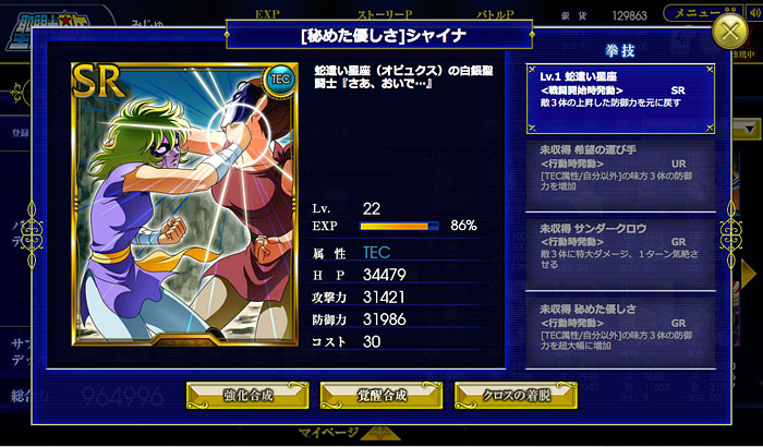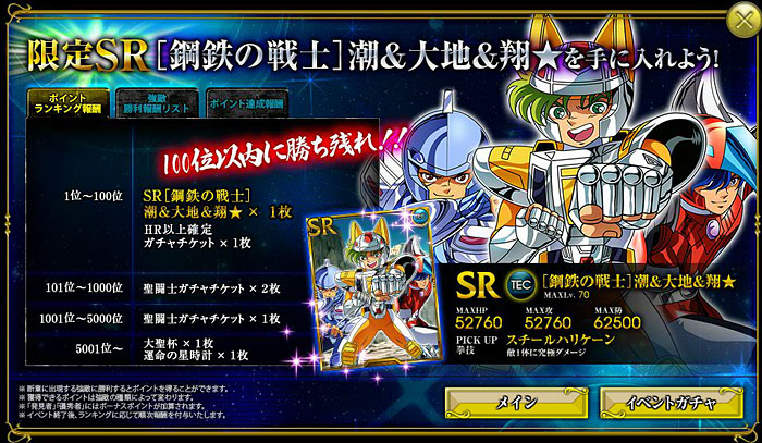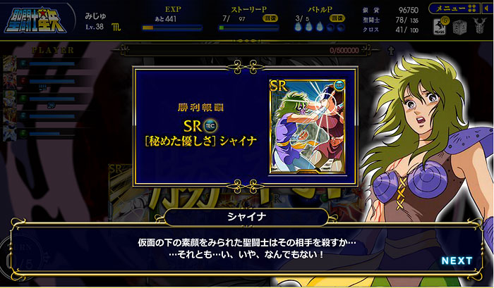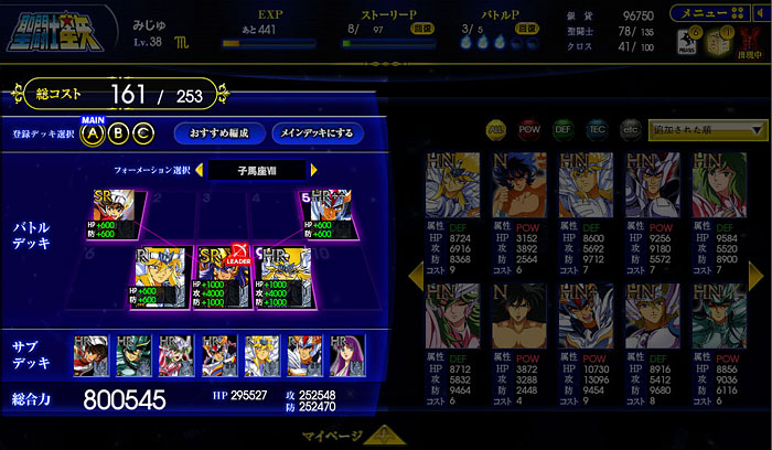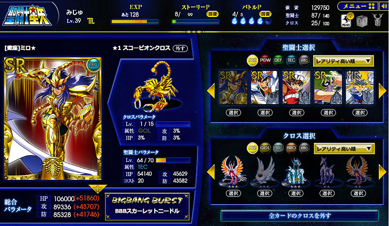 聖闘士星矢 ビッグバンコスモ(2) 先日、シャイナさんを倒しました。( ´艸`) その時のデッキがコチラ。 そして、報酬がコチラ。ただ、せっかくのSRも、技が1個しか覚えてないから微妙〜。*** 2章のボス、一輝をキャンペーン期間中に倒したので、無事スコーピオンのクロスをゲットしました。(^^)v装着したらパラメーターの上がりっぷりがヤバいww 流石、黄金聖衣。そういえば教皇のカード持ってるんですけどw 教皇は双子座の黄金聖衣がイケるらしい。んで、射手座を星矢に、とか、水瓶座を氷河に…でもイケるっぽい。何それ、ミロじゃなくてカミュを選べば良かったか?*** 現在、鋼鉄聖闘士のイベント開催中。ってことで、スチールは正直そんなに惹かれないんですけど(苦笑 アテナのカードはイイネ。覚醒カードなのかぁ・・・欲しいなぁ。 [1回]PR