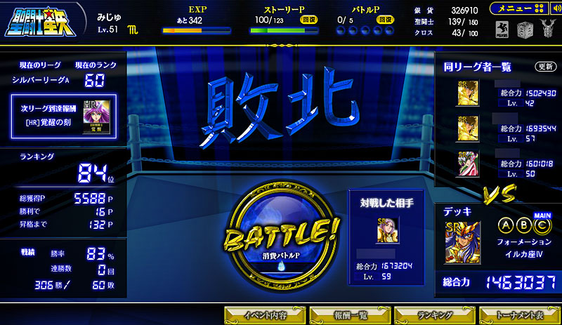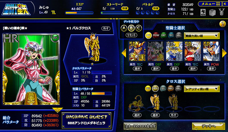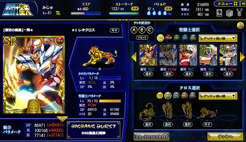 聖闘士星矢 ビッグバンコスモ(3) 第一回ギャラクシアンウォーズ開催中。対人バトルは、相手のデッキも見れて面白いですね。 ただ、シルバーリーグに入った途端、勝てなくなってきました(苦笑総合力が違い過ぎる。みんな凄いなぁ・・・ ちょっと前にHR確定ガチャチケット貰えたので引いてみたら、氷河さんゲット!やったぁ!と思ったけど4枚ないと覚醒出来ないのよね(辛何でも良いから早くSR氷河さんが欲しいよ〜!w 青銅クロスガチャを10連で引いたら、バルゴのクロスをゲットしました!さらに10連引いたら、またバルゴ出て来たw なんだい?運営は乙女座推しなのかい?wシャカ居ないよ〜と思ったけど、ハッ!バルゴの後継者といえば・・・瞬ちゃん!!ってことで早速装着。やっぱ凄いわ〜黄金クロス。 今度は黄金クロスガチャのチケットを1枚手に入れたので、早速ガチャってみた。結果、レオのクロスが出てきました。リア居ないけど、レオを装着出来る青銅といえば・・・ってことでSR兄さんに装着。兄弟揃って強くなった。やったぁ!(^o^)てな感じで、以上、ビッグバンコスモの近況報告でしたw [0回]PR