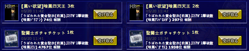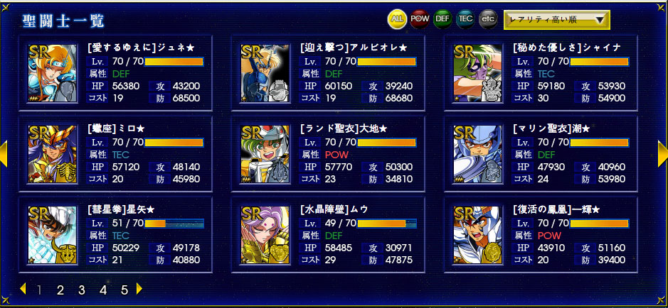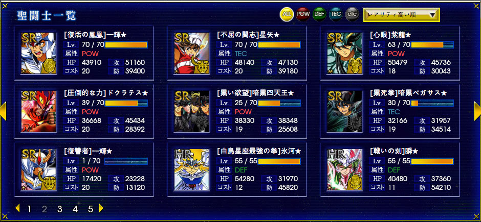 聖闘士星矢 ビッグバンコスモ(6) 最近、イベントが前半戦と後半戦に分かれてるんですが、これイイですね。ブラウザゲームで、一週間近くもランキング維持とか疲れちゃうから無理なんだけど、この方法なら短期集中型な私もイケそうな時は頑張ってみようかな、という気になるwランキング報酬を2回貰えるチャンスもあるしね。前半は全力で頑張って、後半はまったり、とかメリハリも付けられる。 んで、頑張り過ぎちゃった前半戦の結果がコチラw今回の暗黒聖闘士のイベントは4ルートに分かれてるから、ユーザーがレベルに応じて分散する分、上位が狙いやすい。ちょっと走っただけで順位が3ケタだったので、こんなチャンス滅多にないだろうな、と思って、報酬が欲しかった訳でもないのに(だって暗黒聖闘士…)頑張ってしまいましたwが、ちょっと計算ミスってHRが5枚になってしまった。(※覚醒に必要なのは4枚)まぁ多い分には技上げの素材に使えるから良いか。HRが1枚とか2枚とか3枚だけの方が覚醒出来ないし一番困る。 配信開始からずっとやってるけど、イベ報酬等でSRのカードが集まってきました。SRカードが揃ってくるとデッキもそれなりに様になって来たかな。こうなってくるとカードゲームも楽しくなってくるね。本命の氷河さんのSRが無いのが残念ですが、、、 実はあともう一歩って所まで来てるので、覚醒できるまでは頑張ろう。ってことで、ガチャチケかアテナ覚醒カードを下さいw [0回]PR