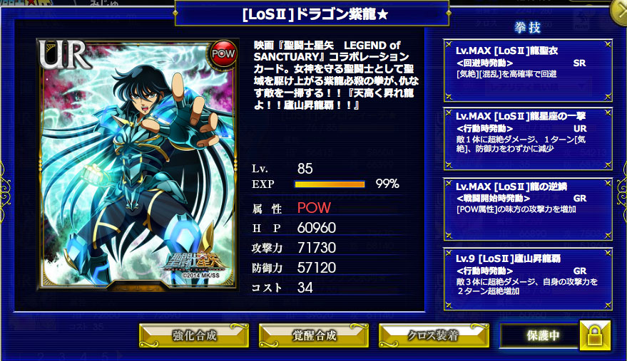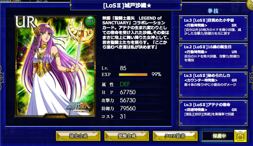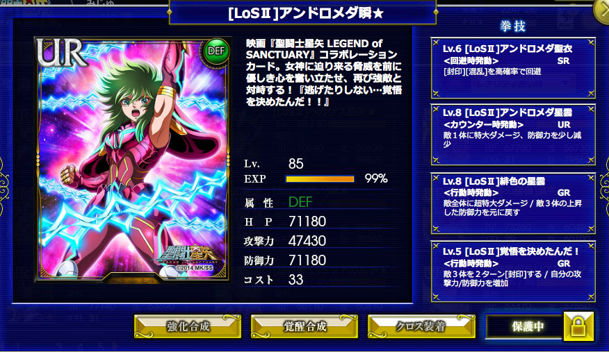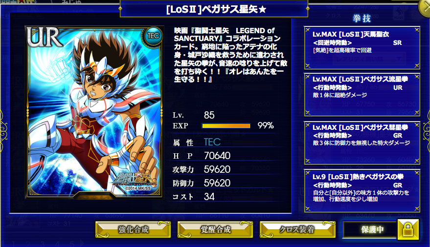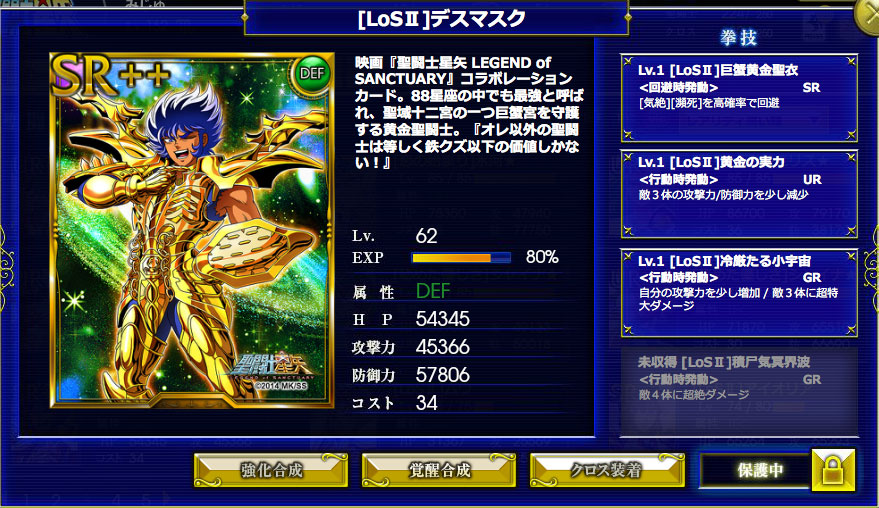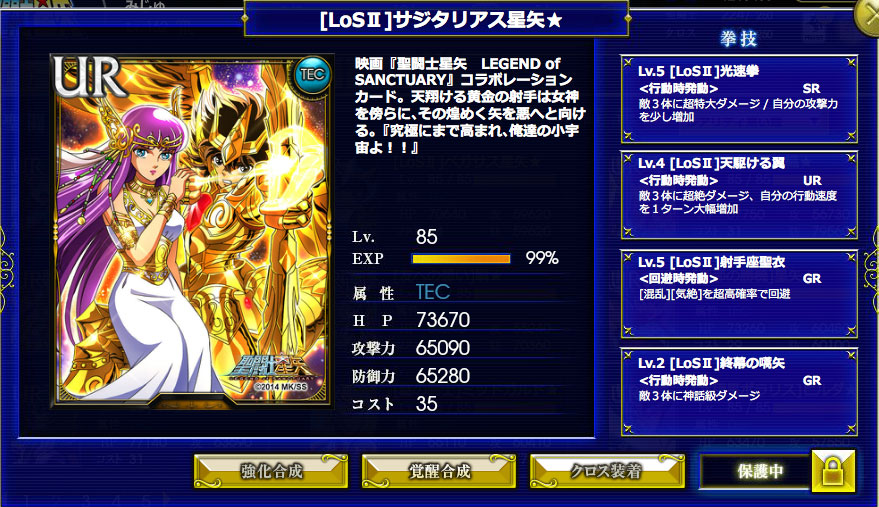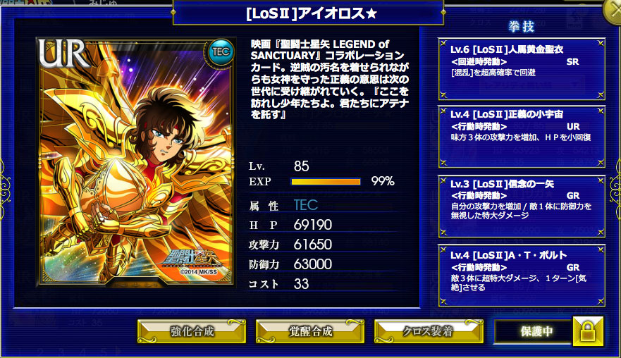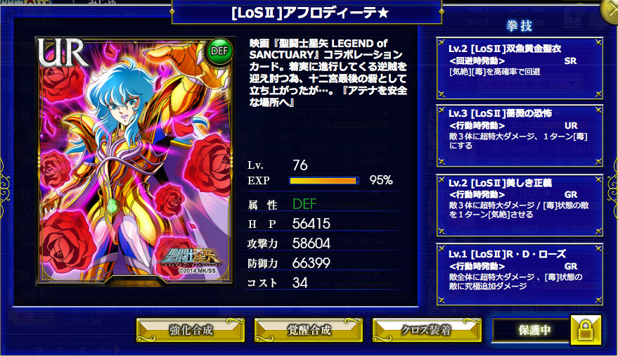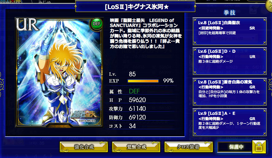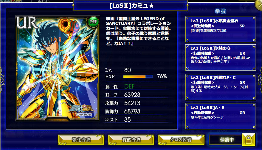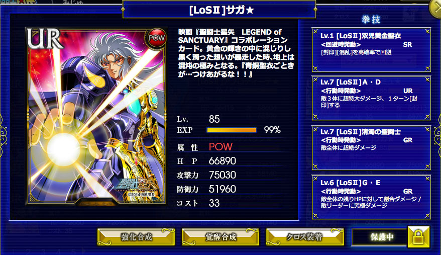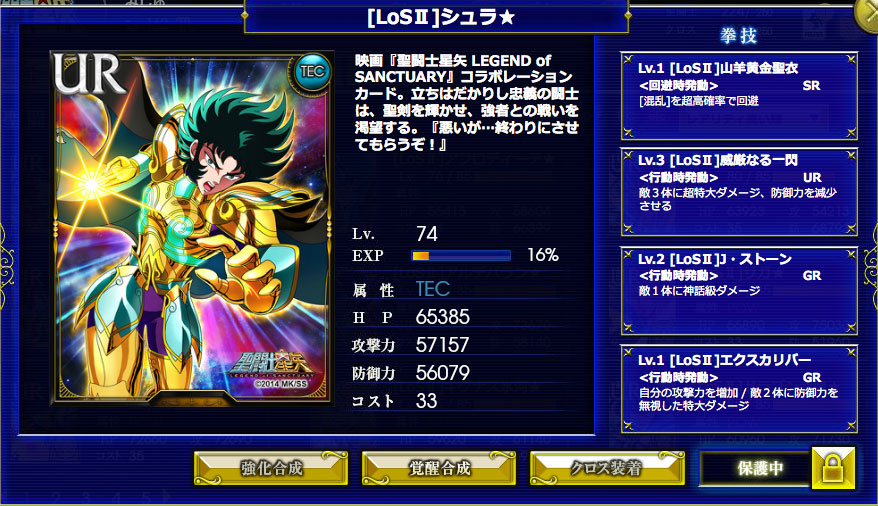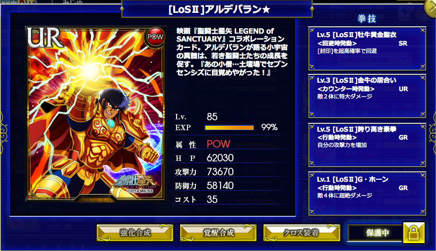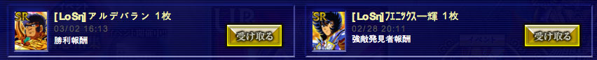聖闘士星矢 ビッグバンコスモ(22) そういえば、ビッグバンコスモの方でもLoSイベ第二弾がありました。前編・後編、上記スクショの回数だけマラソン…ひたすらマラソン。以前出したLoSカード(SR)もレアリティをURに変えて再登場したので、とにかく集めるの大変でした・・・以下、集めたコラボカードたち。 最近はSRからURが主流になっていたので、無課金でこれだけURが手に入ったのはありがたいですね。中でもアイオロスやシュラはスマホ版の方で手に入れてないので、こっちで手に入って嬉しいです。使う場面があるかどうかは謎ですが。 こちらの3枚は、UR最終覚醒まで届きませんでした。 そして、余ったものが2枚・・・・・・。・・・。・・・。シャカ様だけ手に入らなかった・・・。゚(゚´Д`゚)゜。 [0回]PR