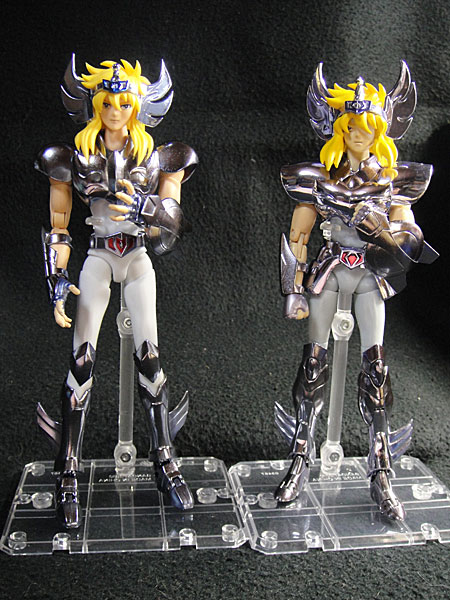 聖闘士聖衣神話EX キグナス氷河 (新生青銅聖衣) 聖闘士聖衣神話EX キグナス氷河 (新生青銅聖衣)ついに発売になりました〜♪ ってことで、早速、我が家に届いたぞ♪ 素体。関節も緩くも固くもなく、丁度良いカンジ。※台座は別売りです 顔は、歴代の神話の中でも一番美人さんになってると思います。氷河さん、睫毛長いなぁ/// 叫び顔。おまる付けた状態の方がしっくりくるかも。アイザックに目を潰された時の・・・なんですが、流血してないと、ただのウィンクですね。可愛いw 聖衣着けて、聖闘士聖衣神話(最終聖衣)の氷河さんと並べてみました。EXは背が少し高くなって、素体・聖衣・髪型・顔、全てにおいてクオリティが上がってると思います。かなりアニメ再現度が高いといいますか。盾も一回り小さくなりましたね。デザイン的に青銅聖衣は最終聖衣が一番好きだけど、こうしてみるとEXのバランスが良くて新生聖衣もカッコイイな、と思えてきました。うう。なんか可愛い♪///(つ∀⊂)/// ブロークンver. 叫び顔とあわせると雰囲気出ますねぇ。ただ、ブロークンver. のベルトのパーツが外れ易いんだけど仕様なのかしら?orz神話EX、見た目も稼働のし易さも、かなりイイ感じです。これ、海将軍シリーズも出ないかなぁ? | д・)チラッ氷河・カミュと来たら、やっぱアイザックも欲しいなぁw [1回]PR