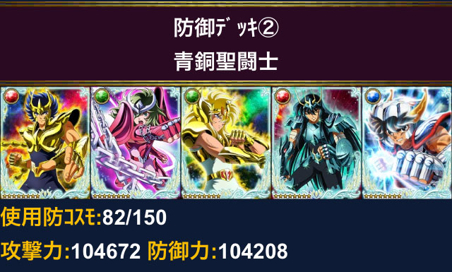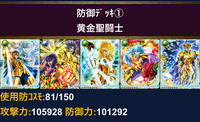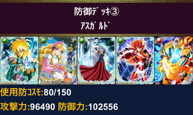 【Mobage】聖闘士星矢 ギャラクシーカードバトル(26) GR+ハーゲンさん買ってしまいました。GR+3枚目としてお迎えしたのが、ハーゲンさんになるとは思いもしなかったwてか、このハーゲンさん、お顔が隠れてて言われなきゃ誰だかわからん気が・・・wんで、ハーゲンさんを買って何がしたかったのかと言いますと・・・ 防御用にアスガルドデッキが作りたかったんですね。この並びであれば、本来ならばテクニック系で揃えるべきなんでしょうけど、でも、氷河・フレアと来たら、やっぱハーゲンを入れたいっ!wでも調べたらハーゲンは、SRかGRしか存在しないの。UR無いの。ヾ(;´▽`A``なんでUR飛ばしてGR出ちゃったんだ、この人?w神闘士ミッドガルドは映画版のキャラで、その正体は氷河だった訳ですが、そのミッドガルドさん、実は一人のキャラクターとしてキャラデザが存在していたんですよね。それがハーゲン(の元になるキャラ。ネットで見たけど設定画ソックリ)。でも劇中では、本物のミッドガルドさんの出番が無かったため、TV版のアスガルド篇でハーゲンとして復活した、と。ってことで、キグナス氷河としてだけでなく、ミッドガルド氷河とも因縁があるっちゃーあるわけでwそう思うとハーゲンも可哀想な奴である。映画版では出番を奪われ、TV版ではフレアを奪われ(注:奪ってませんw)、そりゃあ氷河の言う事を聴く筈がないわww氷河VSハーゲンも個人的にはお気に入りの対決でした。あそこまで氷河を追いつめるなんて…暑さに弱い氷河たん、イイネ!( ´艸`)wってことで、氷河を語る上でハーゲンさんも欠かせないお方なのでしたw***防御デッキ、残り2つは以下のようになっています。 攻撃デッキの黄金を並び替えただけっすね。カミュは技が発動しないので、本当は一番右にした方が良いんだけど、見た目がね、しっくりこないから・・・w 青銅デッキは、防御向けの技が発動するように、一部カード入れ替えてます。…が、やっぱ瞬と兄さんは隣同士にしたいんだよなぁ・・・wこんな感じで、攻撃・防御も、ひとまず完成。あとは技上げで、どこまで火力伸ばせるか、ですね。てか、全部の技上げとか気が遠くなる作業だ・・・(;´Д`A ``` [1回]PR