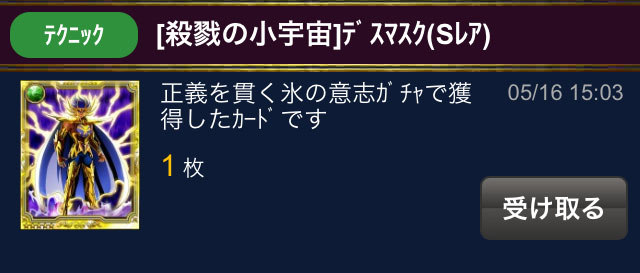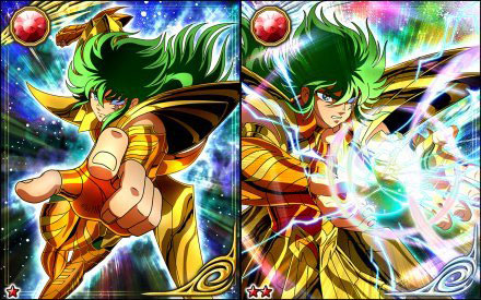 【Mobage】聖闘士星矢 ギャラクシーカードバトル(27) GBお疲れ様でした。軍メンさんの頑張りで、ウチの軍は3ヶ月連続50位以内に入ることができました。自分は防御組なんで、個人順位は全然下なんですがねw報酬のボーダー高過ぎで、まぁ、その辺は諦めてるから良いのです。自分は、攻撃組が安心して戦えるように、神殿守って楽しくバトれれば、それで・・・と言いつつも、公式サークルの板にも出ているように、ウチの軍にも声援で凄い頑張ってくれている軍メンさんも居るので、そういう人たちにも手が届くような報酬設定とかあったらイイなぁ〜とは、ちょっと思ってる。 GB中に、青銅デッキ、またちょっと変えました。[女神の戦士]紫龍さんをお迎えしました。ついでに氷河も[女神の戦士]に変えました。 全アップ系がないのであれば、氷河と紫龍のテク&パワーUP系で伸ばすしかないかなぁと。。。しかし、カードが増えれば増える程、どれから技上げすればいいのか分からなくなってくる。結果、どれも中途半端という・・・(´д`)ハァ*** 新ガチャに、GRアイザック登場!!!!!ぎゃー!!カッコイイ!!!!!(*´Д`*) と思ってお試し100円で引いたら・・・ SRデッちゃんが出た・・・wビックバンコスモと言い、なんか最近、蟹と縁があるのは気のせいか?wその後、手持ちのガチャチケ&お試し200円×5も突っ込んでみたけど、サッパリでした(苦笑そうよね、GRなんて、そう簡単には出ないわよね、うぬぬ。(≧血≦;)あぁ、シベリア師弟デッキに入れて強化したい。ざっくんカッコイイ///大人しくバザー待機するかぁ・・・GRだから高そうだなぁ・・・(´□`;)てか、前線で使うカード集め終わった〜と思ったら次から次へと・・・うぬぬ。(≧血≦;)別に上を目指してる訳ではないし(キリがないし)、GRは身分不相応だから、神氷河だけ!って思ってたのに、美麗絵だから、やっぱ見ると欲しくなってしまう。つらい・・・w [1回]PR