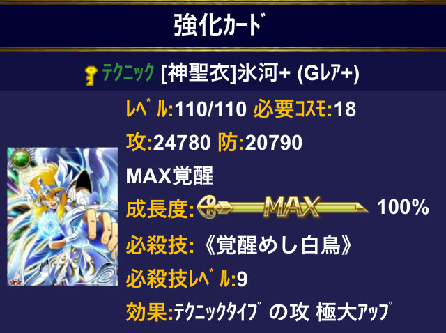 【Mobage】聖闘士星矢 ギャラクシーカードバトル(29) ぬおぉぉぉ〜〜〜!神氷河の技Lv.が、7→9になった!!GRの技上げは一度上がると続けて上がることがあると噂には聞いていたが、UP率1%の壁だというのに、ホントにポンポンと上がりおったwこの調子で、技10までイケるのか?それとも、ここからがホントの1%の壁なのか?てか、GRがひたすらN突っ込むだけで、ここまで上がるなら、URもひたすらN突っ込んでれば上がるんじゃ…?餌にするRは枚数限られてるし、45%でも上がらない時は上がらないのよね・・・(_ _;)だったらノーリスクでやった方が、精神的ダメージなくて済むからwこの調子で、他のカードも技上げて行きたいなぁ。 [1回]PR