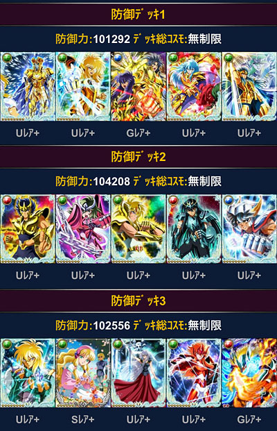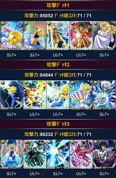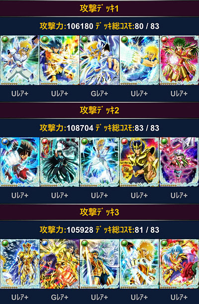 聖闘士星矢 ギャラクシーカードバトル(31) 新ガチャの瞬ちゃん、何コレ素敵!しかも珍しく覚醒後の絵柄イイ!w しかも、このモーションは・・・ッ!!以前、こんな『独り言』を書いたけど、まさに、バルゴの後継者って感じですな。いやぁ、最近、ネタが無くなったのか何なのか、モバ星さんの公式の二次創作っぷりが素晴らしいですなwこの美麗絵で、原作やアニメの再現だけでも素晴らしいのに、(アニメは一部作画がね・・・ゴニョゴニョ)原作やアニメでは見れない創作も投入してくるとは、頑張ってますねぇ。ところで、先日は黄金一輝さんが居たような気がするけど、これ兄弟ネタが続いてるだけなのか、それとも、新柄で水瓶座・氷河さんも来ちゃうのか??アイザック買おうかと思っていたけど、修復貯めておいた方が良さげか?アイザック解禁まで時間あるし、もう少し様子をみよう・・・。*** ビッグバンコスモもGW中ですが、モバ星でもGW始まりましたね。今回は変更点も少なく、前回のデッキをそのまま流用出来るので、ちょっと手直しする程度で済んだわ。ってことで、自分用メモも兼ねて今回のデッキを公開。<青銅クラス>※攻撃のみ 3デッキとも同じくらいの攻撃力ですが、攻撃デッキ2の火力がよく伸びる。単色だと、やっぱ強いな。その代わり相手がダウン系で攻めて来たらアウトですけどwそして防御デッキは、上位クラスの人たちにフルボッコにされるので、今回は設定ナシにしてみようかと。青銅クラスの防御デッキは白銀・黄金クラスからも攻撃対象になるとか、クラス分けしてる意味ないし・・・それじゃ返り討ち率低くなるわな。<白銀・黄金クラス>※デッキ共通 私のメインデッキは、白銀クラスのコスト制限以内に収まってしまうので、白銀と黄金は同じデッキですwつまり、それって実力的には白銀クラス、なんだろうなぁ、と。。。ま、モバ星のGWは、行ける所まで適当に頑張る。ミッション報酬で貰えるもんは貰っとく。・・・というスタイルだから、今回もそれでwデッキの純粋な強さを試せる機会だから、勝ち負けより、その辺を楽しもうと思います。それよりも、ビッグバンコスモのGWの方が難関だよ。。。覚醒アテナ欲しいのに〜(泣 [1回]PR