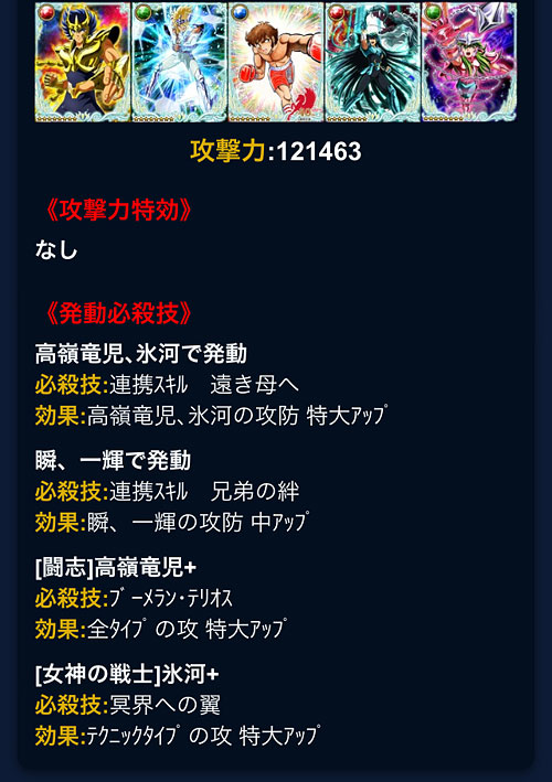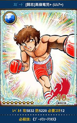 聖闘士星矢 ギャラクシーカードバトル(33) 車田正美先生 熱血画道40周年記念 ログインボーナスキャンペーン車田先生の他作品のキャラクターたちがカードになって登場!!ってことで、リンかけの高嶺竜児(UR)を貰いました。しかも、ちゃんと覚醒出来るように、ご丁寧に2枚も。 ってことで早速MAX覚醒。記念カードなのでステ値低いけど、技が全アップで魅力的。スピード系も星矢とミロくらいしか持ってないから、ちょっとウレシイ。…が、私、車田先生の作品は星矢くらいしか知らないのよね(苦笑てか、星矢もアニメから入ったし。もちろん原作も読みましたけど。ちなみに、このログインボーナスキャンペーンは第3弾まであるらしく、これらのカードは聖闘士星矢に登場するキャラと強力な連携を発動するんだとか。<ログインボーナス:スケジュール>・第1弾 5/30(金)14:00~6/6(金)13:59・第2弾 6/6(金)14:00~6/13(金)13:59・第3弾 6/13(金)14:00~6/20(金)13:59※スケジュールは変更される場合がありますのでご了承下さい。んで、噂によると、第1弾のUR高嶺竜児は、星矢・ポセイドン・氷河と連携するみたいです。・・・ん?・・・氷河・・・だと!?ってことで、氷河と聞いて、早速試してみましたw ※クリックで拡大します連携スキル「遠き母へ」ほう。リンかけ事情がわからないので、ちょっとググってみた。成る程。この子もお母さん亡くしてるのね?(T^T)他の青銅ちゃんとは連携しなかったので、今後出て来る第2弾・第3弾のカードで、結びつけてきそうですね。リンかけ・・・スポーツものってあまり惹かれないんだけど、人気作品なので、いつか機会があったら読んでみたいカモ。【追記】高嶺竜児と星矢or氷河との連携ですが、黄金・地球ぎでも連携発動すると聞いたので、神聖衣でも試してみたら・・・ 連携しました!ただ他の氷河とは別人扱いの様なので、組む時は連携数に注意です。高嶺竜児、これ、聖衣関係無しに連携するとか良いカードだな。属性的には星矢と組むのが一番良いんだろうね。 [0回]PR