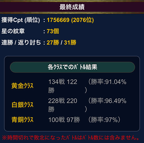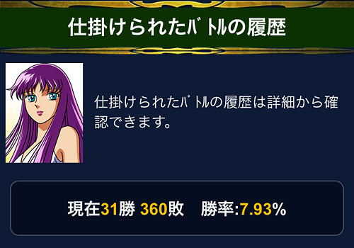 聖闘士星矢 ギャラクシーカードバトル(34) モバ星のGWも終了ってことで、参加された皆様お疲れさまでした。最終成績。基本的にミニ修復しか使わないから、こんなもんだね・・・。いつもは白銀クラスで、ちまちまバトってるんですが、最終日は残業で全くIN出来ず、やべぇ、降格する・・・と思って、ラスト1時間で、黄金クラス3玉攻めで追い上げたところ、降格するどころか、AAAからSランクに上がりましたw最終日って、皆、次回イベに備えるのか走る人少ない→昇格しやすい気がする。。。報酬のSR邪武さん、なんとか覚醒できました。グリ星では常に運営に愛されてる(気がする)邪武さんが、モバ星でもついにSRに昇格ですよ。おめでとー。 ちなみに、こちらグリ星のR邪武さん。めっちゃイケメンw個人的には、こっちの方が好きだw ええと、話をモバ星に戻して・・・GW返り討ちの詳細。ちょっと数えてみました。<返り討ち成功回数> ※白銀・黄金クラスのみ設定・黄金5人デッキ :計10回・青銅5人デッキ :瞬サマ変更前1回、変更後4回、計5回・アスガルドデッキ:計16回という結果でした。 アスガルドデッキ、技上げ殆どしてないのに、意外と頑張ったなぁ。これはちゃんと育ててあげようと思いましたねwてか、何ですかね?SRフレアさんが居るから油断するんですかね?w黄金5人も決して強い方では無いのに、予想以上に健闘したと思います。ミロカノンの全ダウンが効いてるのかなぁ??このデッキは攻撃でも使ってるので、やっぱ技上げだな。頑張ろ。んで、青銅5人デッキ・・・やっぱ伸びが悪いからかなぁ?イマイチですね。瞬さま入れ替えてから、ちょっとだけ成功率上がったっぽいけど、防御力一番高い&連携防アップの割には・・・う〜ん。次回は外してみるか?手持ちのカードも大分増えたし、今なら、連携に拘らなければ、パワーやスピード単色のデッキも組めるかもしれない。ってことで、また色々考えてみよう。てか、デッキ考えるの楽しいんだけど、そうすると、理想のデッキを追い求めて新しいカードが欲しくなるから何かツライww [1回]PR