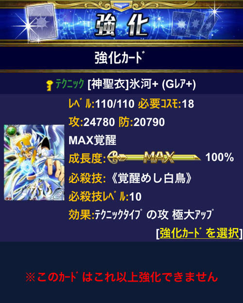 聖闘士星矢 ギャラクシーカードバトル(35) 先日、ついに神氷河さんが技10になりました!(((o(*゚▽゚*)o)))Nカードが溜まってきたから技上げするか〜と何気に挑戦したら一発で9→10に!やっぱり、タイミングというか運次第なんだな、コレ。初めて10に到達したのが、神氷河ってのもウレシイ。ミロカノンは技4で止まってるので、ミロカノンより上げ易かった気がしますwさぁ、残りのカードもこの調子で技上げ頑張ろう! [0回]PR
