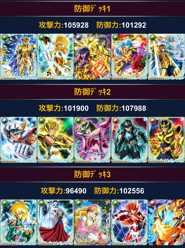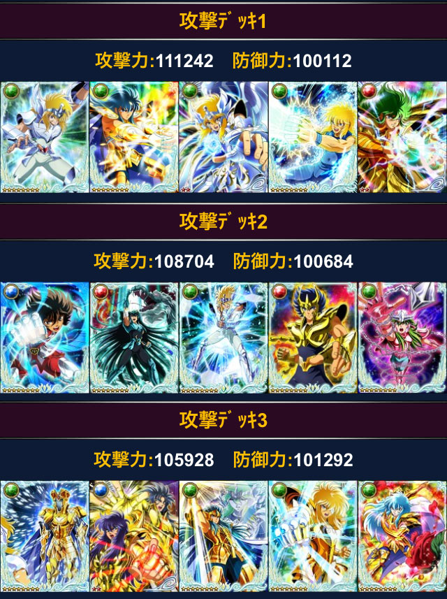 聖闘士星矢 ギャラクシーカードバトル(37) GRアイザックがバザー解禁になったので、思い切って買っちゃいました♪4枚目のGRカードです。GRは神氷河だけにするつもりが、なんだかんだで増えて来たw解禁直後は修復250だったので、どうしようかと思ったけど、粘っていたら夕方には修復190前後まで下がったので、190×2で購入。アイザックのカードは種類が無いし、何よりこのザックン、超イケメンだから凄く欲しかったのです^^ 覚醒前のモーションはコチラ。覚醒前の絵柄の方が凄く好きで覚醒させたくなかったんだけど、それじゃ戦力に出来ないので、覚醒前を堪能してから覚醒しましたw こっちも別に悪くはないんだけどね・・・ 覚醒後のモーションはコチラ。 只今GB中ってことで、早速デッキに組み込んで、このようになりました。ついに、シベリアデッキが攻撃力11万超え!(((o(*゚▽゚*)o)))アイザックの技が「全タイプの攻アップ」だから育て甲斐あるなぁ♪理想の並べ方はこう↓早くアイザックも技10にしたい!(((o(*゚▽゚*)o)))*** 先日、軍メンさん協力のもと、ランクがついに白銀5→白銀6になりました。防御組なので、ポイント稼ぐのに色々協力してくれた軍メンさんには感謝です。モバ星の方が充実してきて、最近、他のソシャゲINしてないわ・・・(^^;)美麗絵カードと軍メンさんとの絡みがある分、今はモバ星が一番面白いです。 [0回]PR