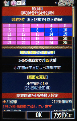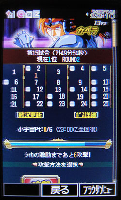 聖闘士星矢 ギャラクシーカードバトル(41) 次回の映画コラボのイベント報酬、また描き下ろし!やっぱ、Ωよりカッコイイ!(笑)そして、映画の星矢くんは16歳、原作の星矢ちゃんは13歳なので、なんか不思議な感じwやっぱ映画の聖衣のデザインは大人っぽいんだな。てか、元々ロス兄さんのものだけどなw映画で星矢くんが、この聖衣を纏うシーン、結構好きです。表情アップになった時がカッコイイのだ。そういえば、今やってるアタック25、auガラケーかなり改善されました。 これ、前回のやつ。 これ、今回のやつ。まずマスの色が一目で分かるようになりました。そして、弾切れで表示されてないけど、マスの選び方がプルダウン式になったので、上下ボタン連打しなくて済むようになりましたwFlashも軽くなったので、全然遊び易くなってる。運営さん頑張りました!けど、やっぱ、このイベは、スマホ版が一番遊び易い訳でw攻略方法が分かってくると、面白いイベなんだけどさ、とにかく修復の消費が激しい。orzGBに向けて自分用修復は溜めてるから、結局ミニ修復のみに絞ると1日1戦しか遊べないの。そういう意味では…つまらないね、確かに。ところで、GWは無くなってしまったのでしょうか。アタック25と交互にやるのかなぁと思ってたのに、来月のスケジュールに入ってないよ〜。自分デッキの強さを試せる、良いイベだったのに(後半飽きるけどw)GW復活希望です!でなければ、自分デッキで戦うイベを増やしてくれ。でないと、せっかく考えて育てて組んだデッキが活かせないじゃないか〜。(T^T)***グリ星、久々にINしたら、カムバックキャンペーンでシオン貰ったw久々に闘技場イベやったら…ちょっと遊び易く改善された?でも、SUR持ってる勢には勝てないぜ。ってことでこっちは今後も暇つぶし程度に遊ぶ予定。引退…はしないよ。もし、モバ星が無くなったらこっちメインにするかもしれないしw [1回]PR