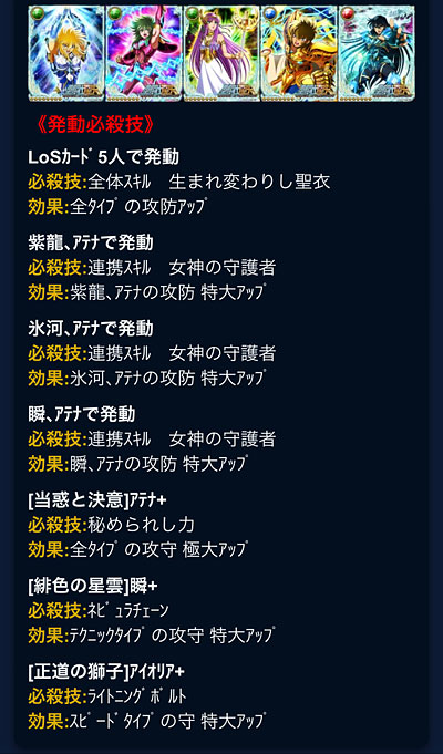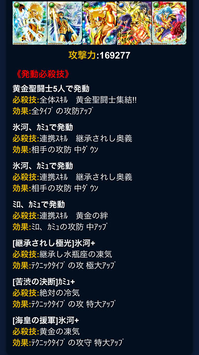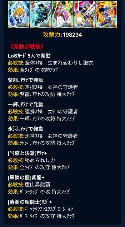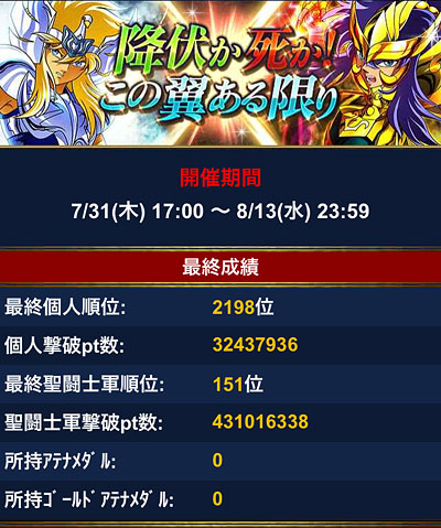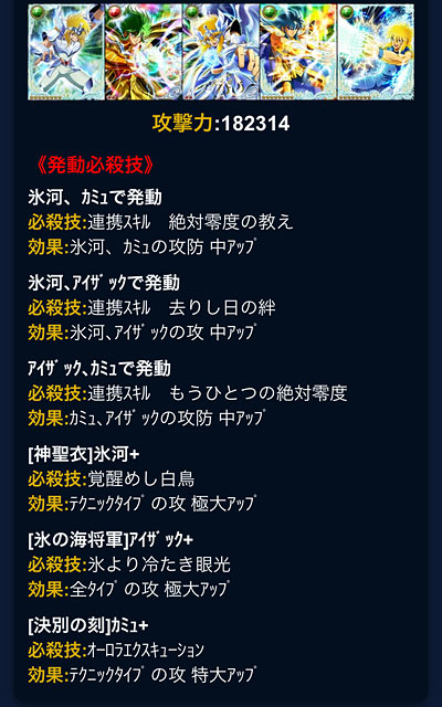 聖闘士星矢 ギャラクシーカードバトル(53) あーーーー、やっとイベ終わった。長かった。今回は報酬がGもUも青銅ちゃんだったせいか、走ってる人少なかったみたいですね。黄金や冥界の方が人気あるんだろうなぁ、やっぱ。ってことで、後半サボってた割には、いつもより、ちょっと順位が良いですwGWの機能がいろいろ改善されて遊び易くなりました。何より報酬が付くようになったのは大きい!しかも無料(修復消費なし)だし♪素晴らしいよ、運営ちゃん! 現時点でのMAX攻撃力を調べてみました。黄金デッキもっと強化したいなぁ・・・技上げ追い付かない〜(;´Д`A ```全部技10になったらどこまで伸びるんでしょうか…早く20万超えたい。少なくともLoSデッキはアテナを技10にするだけで、MAX20万超えるんですよね。でも若干LoSデッキ飽きて来た(おいw 返り討ちの方ですが、意外にこちらもLoSデッキが頑張ってました。もちろんガチデッキには敵いませんが、そこそこ成功してますwこれ、LoS紫龍をLoSサガにして、LoS氷河をLoS星矢(GR)に変えたら、連携とスピUPで、もっと伸びそう。でも、そうすると氷河さんが居なくなってしまうのか。それは駄目だな。wそれ以前に、LoS星矢(GR)を買えるだけの修復がないww他の防御デッキも強化したいんだけど、もう防御隊長を外れたから、そこまで極めなくても別にイイかなぁと・・・ちょっとダメダメになってる自分がいます(笑 とりあえず、報酬GR氷河さんのバザー解禁が待ち遠しいですわ。デッキ強化するのも、まずはそれを手に入れてからだ。 [0回]PR
