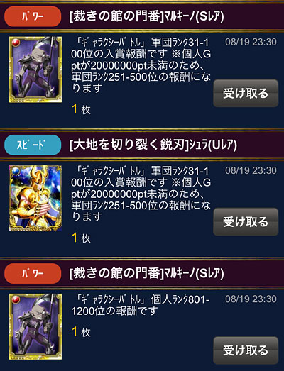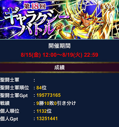 聖闘士星矢 ギャラクシーカードバトル(54) GB参加された方々、お疲れさまでした〜。ってことで結果発表。最終戦、終了直前に逆転されてしまい、10勝なりませんでした(涙凄く悔しい負け方をしてしまいました。(T^T)10勝すればG凸ゲット出来たから余計にね・・・もっと防衛力を身につけなくては!でも、前回100位以下に落ちてしまったけど、今回は100位以内に入れて、とりあえず良かった。徐々に順位上げて、いつの日か50位以内に返り咲きたいね。 手に入れた報酬・・・う〜ん、SR要らねぇwww次回特攻じゃなければ即処分ですよwURのシュラさんは素敵なんですが、1枚しかないし、スピデッキは組んでないから、これも次イベ終わったらサヨナラかな。あとは、G凸は手に入らなかったけど、U凸貰えたから良しとしましょう。何気に最近、U凸を手に入れられるようになってきましたな。まぁ、それだけ課金してるんですけど・・・もう修復すっからかんですよ。このままじゃ来月解禁のGR氷河さんが買えない、ピンチ!wwwそうそう、次イベ予告に、こんなん書いてありました↓また氷河さんなの!?www前回の軍玉でもSR氷河さんだったよね?運営さん推し過ぎだからwwwGRだったら、バザーでいいや、って諦め(?)付くんだけど、SRだと中途半端に頑張っちゃいそうでコワイw [1回]PR
