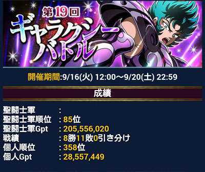聖闘士星矢 ギャラクシーカードバトル(58) やっと氷河さんのボイス聴けた〜〜〜!ハァ(*´Д`*)ハァしかもミロ様まで!!ハァ(*´Д`*)ハァボイス実装二日で星矢・アテナ・紫龍・瞬・兄さんは登場したのに、氷河さんだけずっとお預け状態だったので、どんだけ焦らすんだよ、とか思ってましたwんで、氷河さんの声聴きたさに連打してたらミロまで登場してくれて、本日は俺得なモバ星TOPになりましたw三浦氷河のお声は、やっぱクールでセクシィじゃのう////ハァ(*´Д`*)ハァ関ミロも相変わらずカッコいいです♪ハァ(*´Д`*)ハァなんか・・・ブレソルやりたくなってきたw 皆様、GBお疲れさまでした。m(_ _)miPod touchからスマホに変えたらフォントが丸文字になって、最初見慣れなかったわwって、稼ぎ過ぎじゃあ!俺。www今回からG凸が勝利数報酬からランキング報酬(軍200・個人300位以内)に変わったんですが、過去の戦績からみて、ウチの軍が200位以下になる事は、まず無いと思ったので、Gptノルマが今までの倍になっちゃったけど頑張ってみようかな、と思ったんですよ。そしたら…G凸ゲット最低限の条件、ノルマ18,000,000ptで良かったのに、Gptの調整ミスって何か頑張り過ぎちゃいました(苦笑勝利数報酬が無くなった分、上位軍の順位調整が殆どなくなり、マッチングは良くなったかな、と感じたんですが、やっぱイベ後半になってくると皆ホンキ出してくるから・・・イベ後半キツかった。大量の修復が湯水のように消えてきました…(T^T)シクシク個人300位の壁も超えられなかったし…(T^T)シクシクちなみに、これで軍内2位です。大将が私の倍、Gpt稼いでいた…!(◎Д◎;)ヒエー 念願のG凸ゲットで特攻氷河様が限界突破+2となりました。この勢いで限界突破+9まで行きたい所ですが、その前に破産しますわなw氷河様に貢ぎ過ぎなので、暫くの間、反省モードに入りたいと思います。_ノ乙(、ン、)_ 報酬URのカーサさん。個人と軍で1枚ずつゲット。GB報酬での初UR覚醒がカーサって…。_ノ乙(、ン、)_覚醒前のモーションの方が何か変わってて面白かったです。 報酬SRのミスティさん。冥衣仕様でちょっとカッコイイ。こちらも覚醒済み。 ちなみに、上位報酬のGRはこの方でした。小指wwwちょっと欲しかったなw明日からは新イベントらしいです。 三つの勢力に分かれて戦うみたいですが、やってみないとピンと来ないね。星矢版アタック25がコケたからね、とりあえず運営さんが必死なのは分かったw [0回]PR