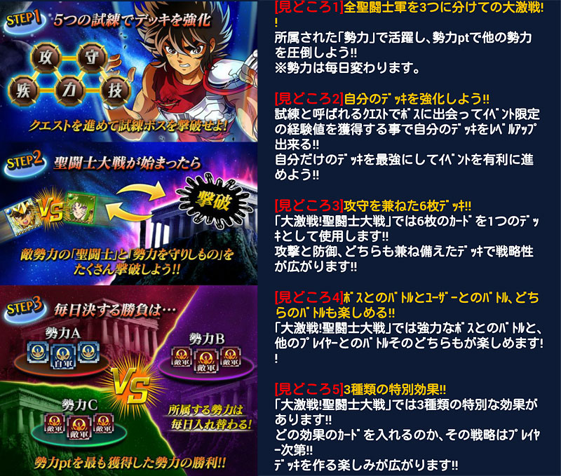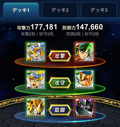 聖闘士星矢 ギャラクシーカードバトル(59) ガチャにチビカミュきたーーーーー!(((o(*゚▽゚*)o))) さらに、SRはミロ様だぁーーーーー!(((o(*゚▽゚*)o)))ってことで、数回ガチャってみたけど、出ませんでした。orzやっぱ手に入れるならバザーかなぁ・・・ 新イベ、一瞬、ミニ修復消費イベかと思いましたが、実際はその逆で、ミニ修復大量GETイベでしたwこれ、軍玉より稼げるんじゃないかな? イベの内容は・・・1)試練でデッキを強化(個玉)※限定ミニ修復を大量GET ↓2)一日3回行われる大戦(個人戦やボス撃破)でポイントゲット(GW+軍玉)※限定ミニ体力と通常ミニ修復を大量GETって感じでした。通常ミニはいつも通り使用上限120個までですが、イベ限定のミニは無制限なので、無課金でもかなり走れます。 さらに今回は攻防一体の6枚デッキってことで、この部分が、なかなか新しくて面白いかと。ステ値や必殺技が、攻撃は攻撃2枚と攻守2枚の4枚が反映され、防御は防御2枚と攻守2枚の4枚が反映されるので、どういう風にデッキ組むのが最適なのか、最初ちょっと悩みましたw今回のイベデッキでは、集結(今回は4人)や連携も発動されるので、特攻が無くても、GWやGBで通用するカードがあれば充分戦えますね。てか、特攻要らないかもwポイントUPの特攻は上手く活用したいところですが、下手に入れると逆に弱くなってしまいます(苦笑入れるなら限界突破必須。今回は、初回だったので試行錯誤してしまいましたが、これ、やり方によっては無課金でも上位イケそうですね。ってことで、次回はもっと上手くイベ進めたい。とりあえず今回は通常ミニ修復が1000個以上プラスされたので、良しとしようw 上位報酬のオルフェさんが素敵過ぎます。ちょっと欲しかったな・・・ [0回]PR