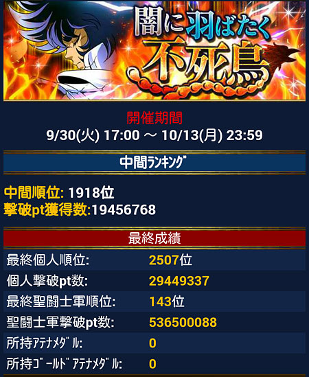 聖闘士星矢 ギャラクシーカードバトル(61) 長〜い個玉イベがやっと終了。お疲れさまでした。今回はリア多忙でスタートダッシュミッションが出来ず、ボーナスミッションだけ頑張りましたw ってことで、G凸1個ゲットで、氷河様が限界突破+3に。イベ後半のデイリーミッションは4日目辺りで放棄wwサボりまくってたけど、超強敵の応援要請がバンバン飛んでくるので、意外と順位ガタ落ちまでは行きませんでした。次は、我が軍が最もチカラを入れているGBだぁ〜!あまりデッキ強化出来てないですけど、頑張ります。と、言っても前回みたいに馬鹿みたいに走りませんよw適度に頑張りますw [0回]PR
