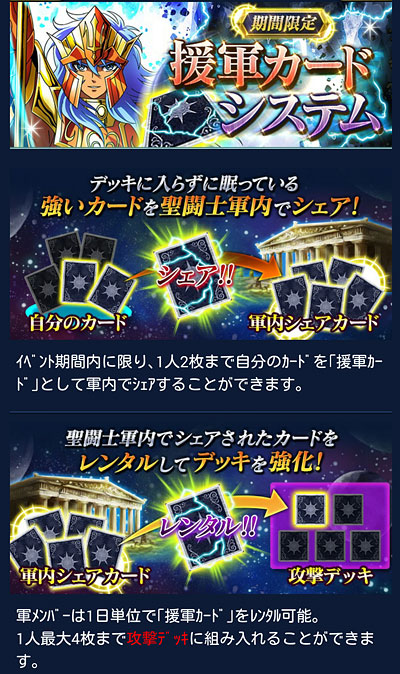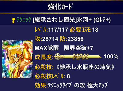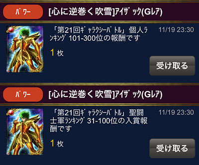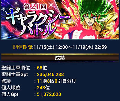 聖闘士星矢 ギャラクシーカードバトル(70) 皆様、GBお疲れさまでした!ってことで結果発表なんですが・・・なんと!今回は個人300位の壁を超えたーーーっ!!ってことで、過去最高の個人順位です!!ついにやっちまったゼ(爆てか、軍も66位!大将不在の中、みんな凄いね、よく頑張りました!軍メンさん達もいつもより獲得Gptが高かったです。 ってことで、GRアイザック、2枚ゲットーーー♪♪♪(∩´∀`∩) 覚醒前のモーション。 覚醒後のモーション。個人的には覚醒前の方が好きですな。アニメで氷河とアイザックが再会したシーンを思い出すわ。***2周年記念の時も報酬GRゲットしてるけど、あれはオマケみたいなもんだったからな、本格的にイベでGR報酬をゲットしたのは、これが初めてです。てか、アイザックじゃなかったら、こんなに頑張れないって(爆今回は防衛・攻撃兼任していたので、早々に獲得Gptが、G凸圏内に入ってしまったんですね。んで、あれ? これ、イケルんじゃね?って思い始めて・・・はい、調子に乗りましたwその結果、軍ノルマGptは達成出来たのですが、順位がギリギリだったので、最後のバトルが終わる迄順位にハラハラしっぱなし。最終日の夜2戦落としてたら個人も軍も貰えなかったと思うと、かなり危険な賭けだったんだなぁと思いますwってことで、まぁ、結果的に獲れたから後悔はしてないけど、もう二度と上位なんか狙わない!(爆バザーの方が安いから云々より、とにかく心臓に悪いですわwちなみに今回は、姉妹軍や知り合いの軍と対決したりと、今迄とは一味違ったGBを楽しめたので、このアイザックのカードを見る度に、今回のGBを思い出すんだろうな(笑そういう意味では思い出のカードになったので、高上がりだったけど良しとします!w***G凸2個ゲットできたので、氷河様が+7になりました。レベル119まで、あと2個・・・ あと、今回から導入されたカードのシェアシステム。これ、良いですね。運Aさん、良い仕事してますよwただ、私、要らないカード直ぐに売っちゃうから、あまり強いカード余ってないww今度から、シェア用にとっておくようにしよう。 [0回]PR