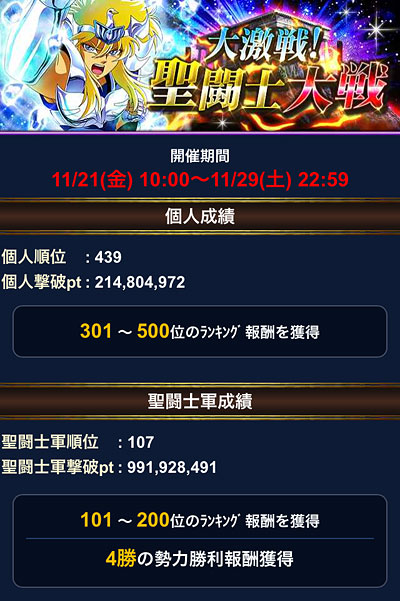 聖闘士星矢 ギャラクシーカードバトル(72) イベお疲れさまでした。月末〜月初めは仕事が忙しいのよ〜ってことで、殆ど22時しか参戦できず、さらに仕様変更でどうなるかと思ったけど、出れる時は神殿攻撃役としてガンガン殴っていたので、今回も軍内2位という好成績で終わることができましたw昼間は大将に任せっきりでした。スミマセン(汗ちなみに今回の仕様変更、最初は如何なものかと思ったけど、毎日、大戦に参戦するだけで限定ミニ補充出来るし、試練はデッキの強化だけを考えれば良いから逆に楽でした(爆底尽きかけていたオリハルコンも補充出来たしw一日一戦だけでも、それなりに稼げるもんですねー♪って、今回は特攻アイザックが居たからなぁ、次回は流石に厳しいか? とりあえず、報酬のURアフロ様1枚ゲット♪アフロ様って必殺技あまり恵まれてないけど、今使ってるアフロ様よりはマシ。ってことで、バザー解禁になったら、もう1枚買って覚醒して使おうかなぁと。基本的にチビシリーズは高いけど、これは安いと良いなぁw ちなみに、モーションはこんな感じでした。*** あ、そうそう、先日、モバ星を始めてから、480日経過しました。どこまで続けられるかは・・・もちろん運Aちゃん次第です(爆次回の個玉も初心者向けに改善されてるみたいだし?その調子で、これからも頑張ってくれ。改悪は駄目だゾ(爆 [0回]PR
