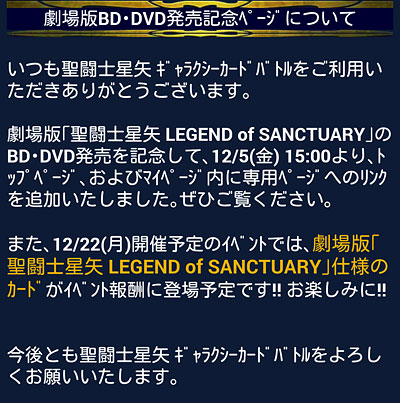 聖闘士星矢 ギャラクシーカードバトル(73) このシーン(台詞)、凄い好きなんだよなー(爆 そんな話はさておき、気付いたら個玉の中間終わってました。昨日は某灰色バンドさんのライブを観に行っていたし、今週ずっと寝不足で、今日は死んだように眠っていたし(爆殆どINできず・・・orzこの乱れた生活リズム、GBまでには立て直したい。 ところで、このTOP画像の絵柄気になるんですが・・・ 新カードは紫龍なのよね。どーゆーこと!?w氷河さん目が隠れててもイケメン。この氷河さんください(爆 LE第3弾は星矢ちゃんです。ほうほう。となると残りはアノ兄弟ですね。ラストはどっちかな? LEの星矢ちゃんはもちろん、URのジュリアン様(覚醒後)も素敵だったので(笑ガチャチケ4枚+お試し100円だけガチャリンコしてみたんですが・・・ お姉さんゲットで終了しました。orzジュリアン様欲しいなぁ〜〜〜(そっちかいw ボーナスミッションの本命G凸、今回も頑張った!wGB特攻氷河様、限界突破+9まで、あと1個! あとGアイザックの技がやっと10になりました〜♪GR自力で技10にしたの、これが2枚目。 ん?またLoSカードの新しいの出るのかな?これ追加キャラ期待していいのかな?手抜きで3DCGヴァージョンだったらどうしようwwまた、描きおろしに期待♪ [0回]PR