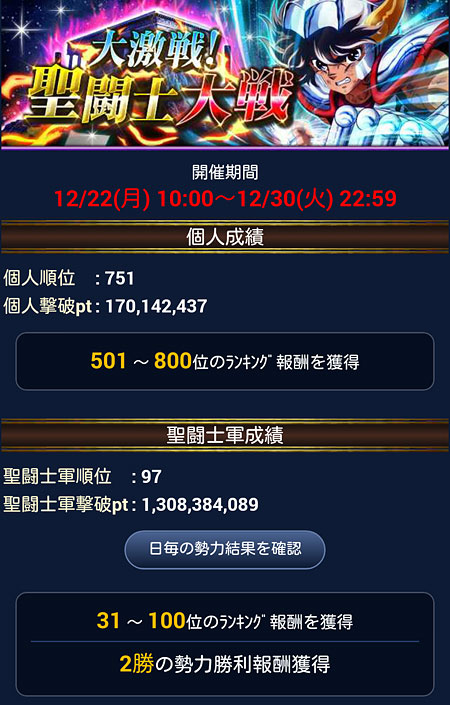聖闘士星矢 ギャラクシーカードバトル(79) まずは前イベの結果から。ランキング報酬のLoS蟹2枚、LoSシュラ1枚ゲットしました。蟹は防御で使おうと思ってたから、手に入って嬉しいです♪逆にシュラは1枚だけだから…どうしようかなぁ(悩 そして、これって恒例なのかしら?昨年もあった新春ガチャ。 今年の目玉カードは・・・ついに、運営やっちゃったww完全ネタカード。と思いきや、ステ値は凄く良いです。お試し300円(1回限り)でUR以上確定なので、今年も運試しじゃ! ↓ ↓ ↓ ↓ ↓ 昨年に引き続き、今回もミロ様ゲット!しかも至高ミロ様!このままリダカ用にしたいような、覚醒して使いたい様な・・・昨年引き当てたミロ様は売っちゃったけど(爆このミロ様は大事にするよ!2年連続ミロ様・・・良いスタートですね、嬉しいです♪ [0回]PR