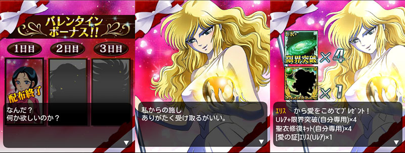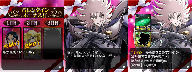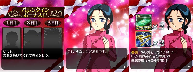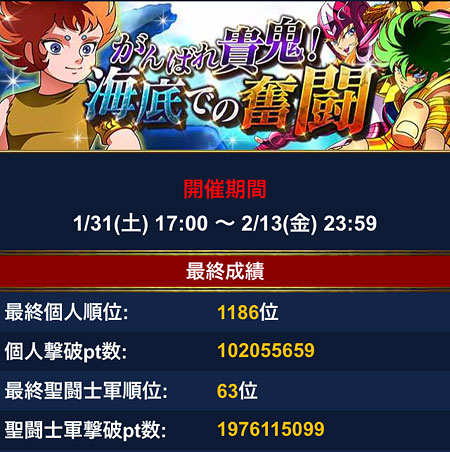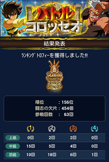 聖闘士星矢 ギャラクシーカードバトル(87) 結局、Gカノンちゃん買っちゃいましたww覚醒済みで修復164個でした。最近のカードは未覚醒で200超えとか多いから、それと比べると安いほうだけど・・・駄目です、完全に金欠病です。暫く大人しくしてます(苦笑 個玉の結果発表。特に何も狙っていなかったのですが、今回、新機能コロッセオをやっていた関係で、ギリ1200位以内いけましたw今回は軍位も凄いですね。軍メンさんガチャ当てまくりだったからなぁwちなみに、そのコロッセオの結果はこちら↓ 参戦者少なかったおかげで、200位以内に入れましたw最初は初級で、後半は中級で頑張っておりました。序盤は放置の人も多いので、1時間張り付いてなくても、ちょこっとやるだけで結構勝てたりw個玉は特攻引き当てないと走るのは難しいので、そういう時はこちらのコロッセオを頑張るのもアリかもしれないですね。トロフィーだけで報酬ないけど(爆ちなみに、もう二度とやらないと思います。競い合うとアイテムの消費がパネェです(苦笑バザーでコツコツ貯めた回復薬が・・・ぁぁぁぁorz2/14はバレンタインってことで、三日連続ログインボーナスがありました。 一日目、春麗。 二日目、エリス。って、頬赤らめるな!w 三日目、まさかのバレンタイン(男)wwただの名前繋がりww しかも頬赤らめるな!wwでもG凸は嬉しかったです♪まさか散撒いてくれるとは♪ ちなみに貰ったカードはコチラです。おまけカードなのでステ値は実戦向きではないですね。 [0回]PR