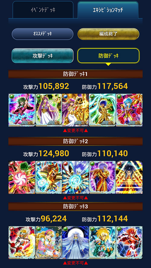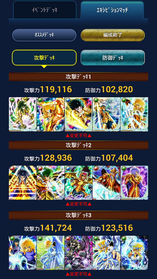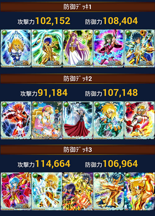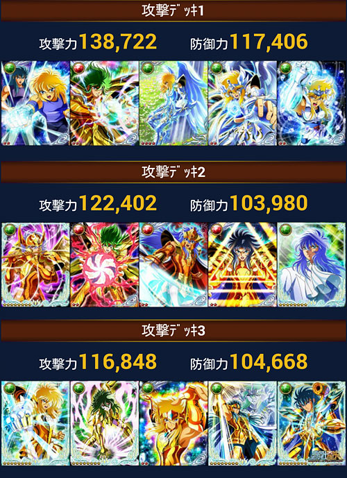 聖闘士星矢 ギャラクシーカードバトル(88) 次のGBの報酬URが、氷河さんだぁぁぁ!!!!ま、多分バザーで買うと思いますけどねw次のGBは「修復だいじに」作戦でいきますから!(切実これはBD-BOXで使われていた絵柄ですね。もうデッキにNEW氷河さん入れるスペースないんだけど(汗でも、技が全タイプの攻アップと聞いて、また青銅デッキ組みたくなってきました。やっぱり青銅ちゃん好きなんで♪でも、前に報酬で貰ったUR星矢ちゃんや一輝兄さん、バザーで売ってしまったんだよね(-_-)今のデッキ解体したくないし…マーマIDで作るか…悩むw 今回から、本番前にエキシビションマッチが行われることになりました。報酬・順位関係無しなので、まぁ、お遊び?準備運動?運営的にはサーバー確認もあるのかな?(苦笑デッキも専用のデッキを組まなくてはならなくて、こんな感じにしました↓ センターは固定ってことで、どれも持ってないカードだったので、そこに合わせてデッキ組むの面白かったです。防御に海デッキもちょっと良いなぁと思ったり・・・アスガルドなんかコレ理想系だわ・・・Gヒルダ様欲しい〜!wただ、エキシビションマッチ自体は活気がイマイチでつまらなかったです(爆運営ちゃん、なんとかしてw 今回の通常デッキは、こんなカンジです。相変わらず技上げが追い付いておりませんwあと、最近、朝起きれないので、朝8時の回がちょっと不安ですw [0回]PR