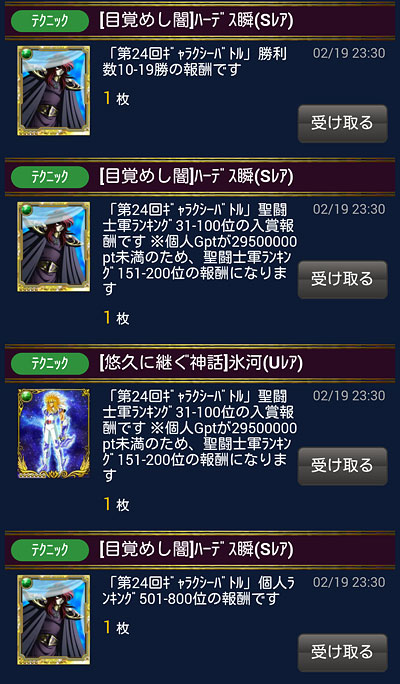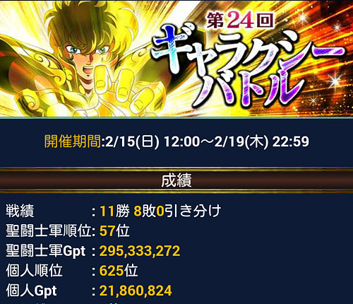 聖闘士星矢 ギャラクシーカードバトル(89) 今回でGBも24回目ですか。まぁ、私は途中参加なんで24回もやってないですけど、今の軍に入って1年以上経ってるので、最低でも半分以上は参戦してるんですなぁ。よく、ここまで続いてるよ、イベじゃなくて、私が(笑私、飽きっぽいからねぇ、ソシャゲ色々齧ったけど、ここまで続いてるのモバ星だけ!ってことで日々記録更新中です(笑GBの結果発表。50位以内に入れそうでなかなか入れず。やっぱ上位争いは厳しいwでも、今回も10勝以上出来たし、軍が確実に強くなって来てるのを感じます。今、軍内は凄くイイ感じだと思います♪ 個人の方は500位以内は無理でしたが、軍位の方でUR氷河さん1枚ゲットできました。公式サークルや軍内の声を聞いてると、やっぱ覚醒後の絵柄は不評の様ですね・・・ ちなみにモーションはコチラ。他の氷河さんに比べると髪の毛のボリュームが凄いような気がするんですけどww頭がデカく見える(汗)モーションまでこのバランスにしなくても・・・ww*** 今回の上位報酬のGRアイオリアさんが、かめ●め波ならば、 ガチャのGRタナトスさんは、元●玉にしか見えませんなww良い笑顔だ♡(笑 [0回]PR