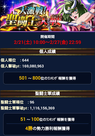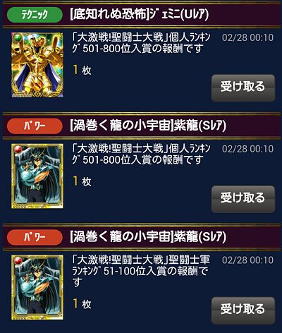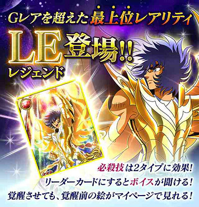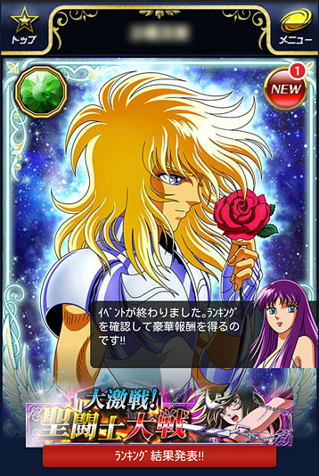 聖闘士星矢 ギャラクシーカードバトル(91) 聖闘士大戦終了〜ってことで、イベント結果発表。GB以外は軍として走ることはしてないけど、人数増えてイベ参加率良くなったので、100位以内に入れました。有り難いですね。 手に入れた報酬たち。UR手に入れましたが、ジェミニさんなので、あまりテンション上がらない(爆*** 神話シリーズの氷河さん、解禁になったのでバザーで購入。やっぱり頭(顔)のバランス悪いよね。でも元絵の段階でこうだった気がするので、まぁ・・・仕方ないか。んで、モーションどんなんだろ?と思って見てみたら・・・ マーマ!www しかも薔薇加えて白鳥ダンスwwwww運営グッジョブですww とても気に入ったので暫くリダカにしておきます(爆*** LEガチャに、一輝兄さん登場! これで、LE神聖衣シリーズの青銅ちゃんたちが出揃いました。次のLEは・・・やっぱアテナかな?? 出揃った記念に、並べてみました♪色鮮やかw全部揃えるのにいくらかかるんだろうなぁ・・・私には一生無理ですね(爆 次イベの報酬にGR童虎さん来ました。覚醒後、ナニコレ切ない…シオン様…(T^T)単純にカッコいいポーズのカードも良いけど、こういうストーリー性のあるカードも素敵ですね。 そして、報酬のURに神話シリーズの瞬ちゃん登場!ナニコレ可愛い!!!!!ちなみに今までに登場した神話シリーズ ↓残りは紫龍さんだけですな。 覚醒後の氷河さん微妙だけど、一輝兄さんも酷いです(涙ってことで、このシリーズ、あまり興味なかったんだけど、瞬ちゃん素敵だったので、やっぱ揃えたくなってきましたwwまずは星矢ちゃん、売っちゃったけど買い戻そうかな・・・(爆紫龍さんは美人に描かれますように!(切実 [0回]PR