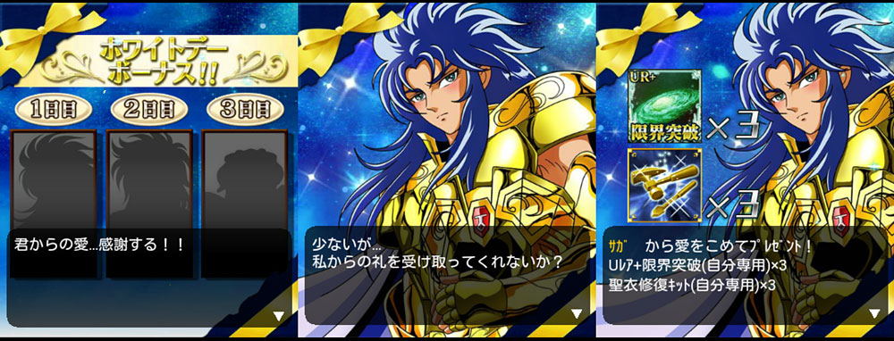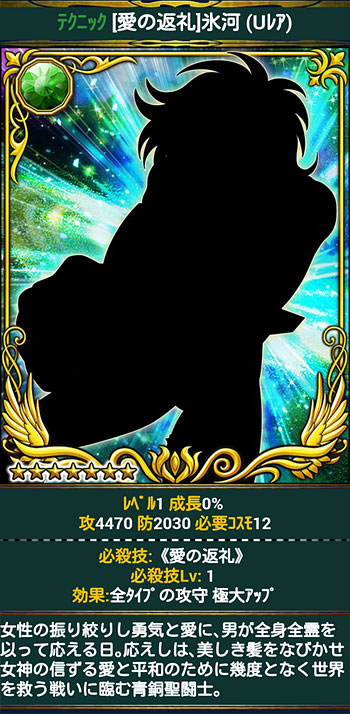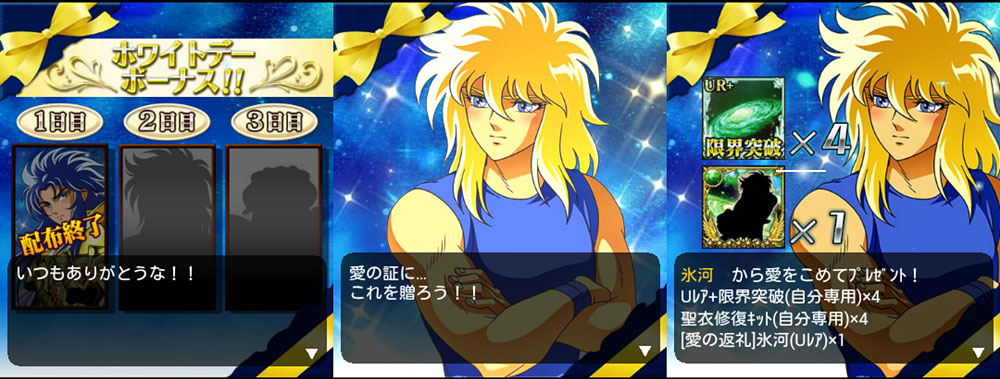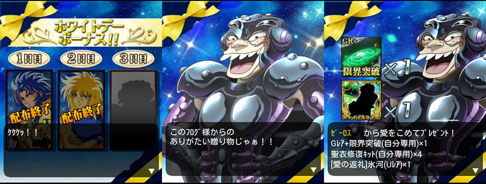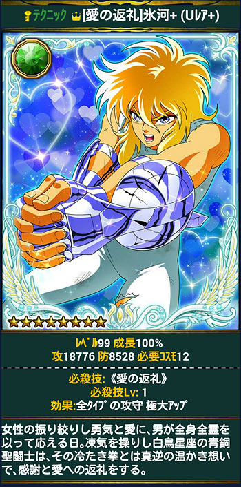 聖闘士星矢 ギャラクシーカードバトル(95) モバ星・ホワイトデー3日連続ログインボーナス♪ 3/13(1日目)サガ様〜♡頬染めてるwwこんな公式サガ様を拝めるのはモバ星だけ!(多分wそしてホワイトデー当日!3/14(2日目)は・・・・ まさかの大本命キターーーーーーー!!!!!!ヽ(*´∀`*)ノ シルエットがこのNカードと完全一致してたので、初日からドキドキしていましたがwまさか二次元初恋の相手からホワイトデー貰える日が来るなんて夢にも思わなかったよwwバレンタインではエリスから貰ったから、その流れでこの人選なんでしょうなぁ。でも、それだと絵梨衣ちゃんじゃなくてエリスが氷河に想いを寄せてるみたいじゃないか…ゴニョゴニョ(汗「愛の証に…コレを贈ろう!!」だって。(∩´∀`∩)ムフフ♡氷河さんからのプレゼントなら何でも嬉しいよ〜(∩´∀`∩)ムフフ♡てか、モバ星はいつから乙女ゲーになったの?ってカンジww頬染め氷河さんカワイイ♡頬染め氷河さんと言えば、劇場版のコレ↓も印象深いのですがwこれもカードにしちゃいましょうよ♪モバ星さん♪(爆SRで良いんで。ただリダカにしたいだけなんでwんで、テンション上がったところでラスト行きます。 ↓ ↓ ↓ ↓ ↓3/15(3日目)・・・。( ̄ロ ̄|||)シルエットの時点で嫌な予感はしていたが、なんでカエルなんだぁ〜〜〜!?orzサガ(イケメン)→氷河(イケメン)と来てコレは後味悪過ぎるwwwG凸貰っても・・・なんか嬉しく無いw G凸あと8つ寄越せや!(爆でなければ、お前なんか、さっさと氷河にぶっ飛ばされてしまえ〜〜〜!。゚(゚*´Д⊂ウワーン***後味悪過ぎるので、ここで今回運営様から頂いたカードを見てみましょうw 過去のSRの背景を変えただけのモノですが、ハート柄に変えただけでこんなにラブリー♡になるとは(爆聖衣ボロボロだけど良いのか?って感じもしますがwwまさに「全身全霊を以って応える日」って感じですね。覚醒前の「美しき髪をなびかせ」って表現もGJ!ですよ〜♪ちなみに実戦で使うと「受け取ってくれ!!」と言いますww技構えて「受け取ってくれ!!」とか、もうギャグ・・・(爆 バレンタインで貰ったエリスのカードと連携が発動しました。[愛の証]エリス、[愛の返礼]氷河で発動必殺技:連携スキル 愛の力全タイプの攻防 特大アップ絵梨衣ちゃんじゃなくてエリスで『愛の力』って・・・(肉体は絵梨衣ちゃんだけど…)氷河の聖衣がボロボロなのも、エリスの『愛の力』のせいなんじゃないかって思えてキタw何この新しいカップリング・・・wご祝儀カードなのでステ値低いけど、連携スキルや必殺技は良いのでGW青銅クラスとかで使えそうですね。エリスはともかく、氷河さんはハート背景可愛いからGWで使おうと思いますw [0回]PR