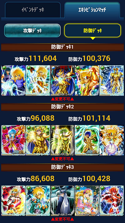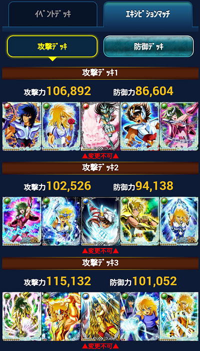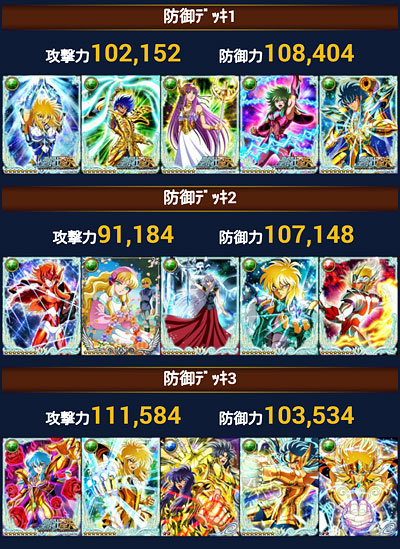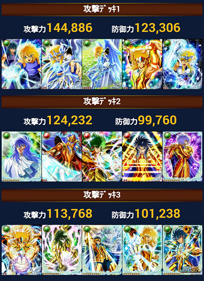 聖闘士星矢 ギャラクシーカードバトル(96) 今月もGBの期間がやってきました。 前回から始まったエキシビションマッチ。今回は固定カードが何故かSR・・・もう適当でいいやと思った(爆普段使えない様なLEとかGRとかだったら、デッキ組むのも楽しいんだけど・・・ 今回の本番デッキはこんな感じになっております。もうシベリア師弟・・・というか氷河デッキにしてしまいましたwチビ氷河さんが何気にカミュ扱いだから便利ですwwそして、全アップのアイザックを海皇にお返ししましたw単色アップのアイザックは援軍カードへ・・・援軍カード機能ですが、我が軍では大盛況って感じですね。ホントに良い機能をつけてくれました。そういえば、今回のGB報酬に神話シリーズの紫龍さんが来て出揃いましたが・・・ やっぱ覚醒後微妙だった・・・(ToT)せっかくの新シリーズなのに・・・星矢と瞬ちゃん以外絵柄微妙って・・・覚醒前と覚醒後の絵柄チェンジして欲しいわ、マジで・・・デッキ組もうかと思ってたけど、もし特大連携付いてても、ちょっと微妙だな・・・コレ。 [0回]PR
