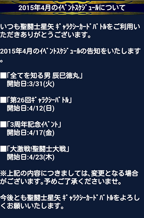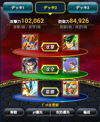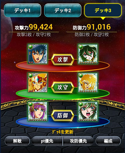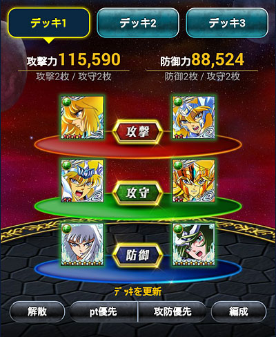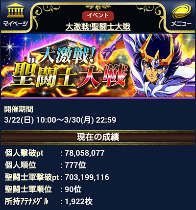 聖闘士星矢 ギャラクシーカードバトル(98) 聖闘士大戦、中間発表。777位だって。なんか縁起イイネ(笑 中間の報酬で、水晶先生のカードを1枚ゲット。バザー解禁になったら覚醒しよう。シベリア好きとしては、一応・・・ねw需要あるかどうかは別として、SRの水晶先生は洗脳されてて怖かったから、ちゃんとした絵柄、しかもURで出してくれたのは評価するwところで、TV版フレアさんのURはまだですか?アスガルド防御で使いたいんですけどー! 今回の大戦デッキ。また微妙に変えました。※数値は試練やる前の初期値です。 試練は、ミッションに支障が出ない程度に上げてますw多分、もうこれ以上は上げないと思いますw*** ついに、3周年記念イベントの告知が来ましたねー。走るかどうかは報酬にもよりますが・・・ミニ修復が大量に溜まってるので、また無制限にして欲しいなぁw そして、モバ星始めて、600日が経過しました。 [0回]PR