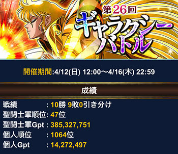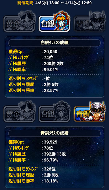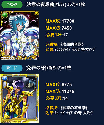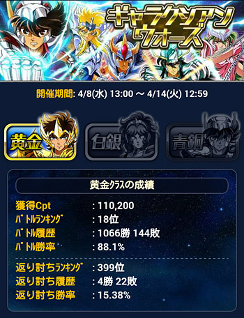 聖闘士星矢 ギャラクシーカードバトル(101) 第26回GBの結果発表。ついに、久々の50位以内達成! ということで、久々のトロフィーゲット。 手に入れた報酬はコチラ。URオルフェ、1枚だけど嬉しい♪でも、オルフェさんって良い技持ってるの多い&イケメンだけど、連携・集結を考えると使い辛いんだよな。でも、せっかくだから特攻切れた後も覚醒して、どこかで活かしたい・・・ミロ様は未覚醒・覚醒済み、両方とも永久保存版でw未覚醒のモーション面白かったですよww カノンが、ただ立ってるだけというwww GB中にGRソレントを買っちゃいました。技上げ面倒いので、技10で。URソレントの方が強いけど、海デッキもGRで揃えたいなぁと思ってw新カード待とうかなとも思ったけど、どうせ出てもお高いんでしょう?wじゃあ、とりあえずコレでいいや、となりました(爆デッキの見た目は凄く良くなりましたw そうそう、前回のGW、久々に頑張ってみましたw 白銀・青銅クラスはこんな感じ。なるべく全クラス100位以内を目標にしていますが、前回頑張り過ぎたせいで、今はちょっとサボり気味だったり・・・ [0回]PR