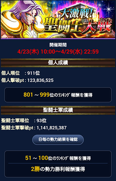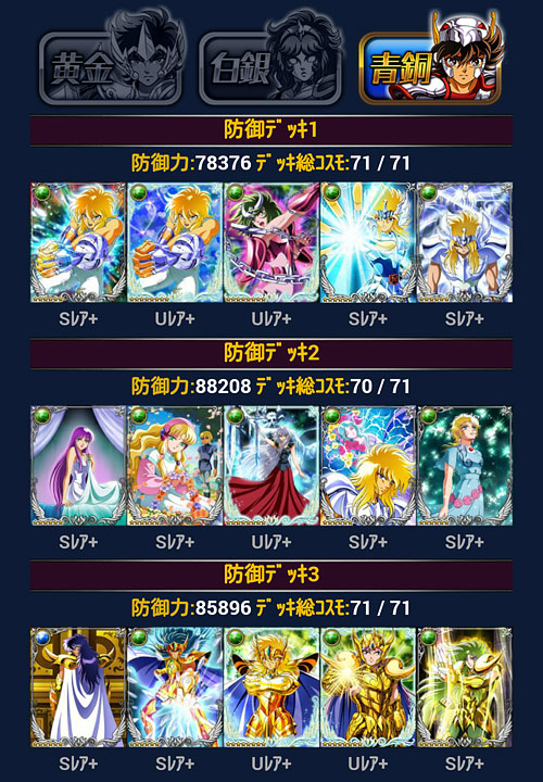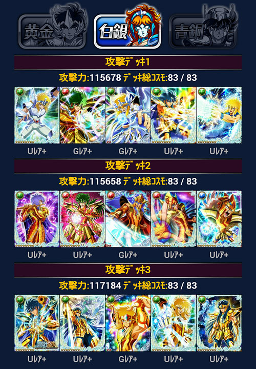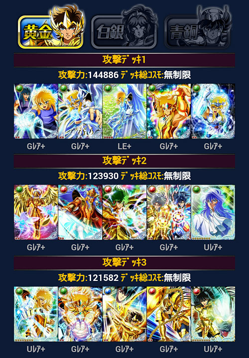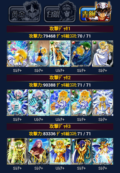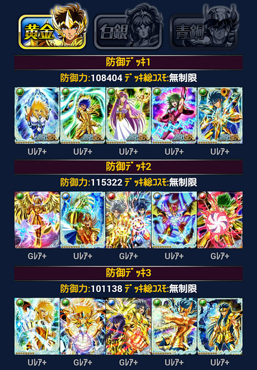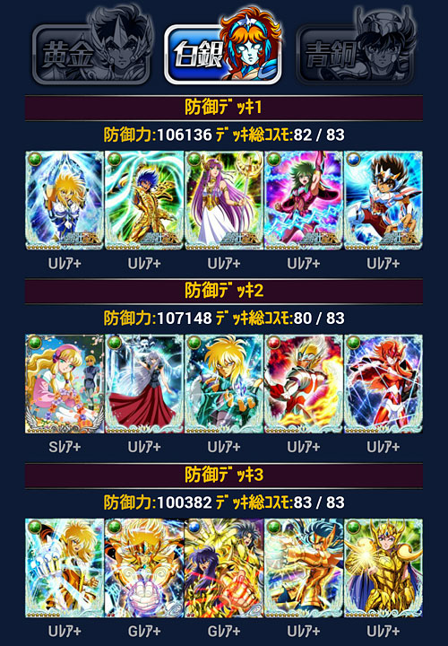 聖闘士星矢 ギャラクシーカードバトル(103) モバ星を始めて630日が経過しました。ちなみに、PC版のビッグバンコスモの方も何とか1周年ポチポチやってきたけど、こちらは無課金でやってるので、そろそろ限界を感じて飽きてきました(爆 聖闘士大戦の結果発表。今回は多忙の為、主に22時メインで参戦。ギリギリ1000位以内入れましたwウチはGBメインなんで、他イベはゆる〜く行きますよ、ゆる〜くwアイテム回収出来れば、それで良しw***GRカノン&サガを手に入れたのをキッカケに、少しデッキの見直し・変更を行いました。 3番目の攻撃デッキ=黄金聖闘士デッキがずっとしっくり来なかったので、奮発して氷河・星矢・紫龍の組み合わせにしました。これでG凸あったら最高なんだけどなぁw防御もアスガルドから海に変更。…が、全ダウン持ちのポセインドン様が欲しいんだけど、今、出回ってないんですよね(苦笑LE対策でダウン系が人気みたいです。トホホ。いつか見かけたら買いますw 白銀クラス。黄金デッキは別人扱い駆使して氷河とカミュの二人の世界にしてやったり(爆白銀クラスの防御も海にしようと思ったらコスト制限で上手く組めなかったので、アスガルド勢はここで続投となりました。返り討ち履歴みたら意外と頑張ってるw 青銅クラス。もう若干ネタですね。見た目良ければ全て良しですよ(爆 [0回]PR