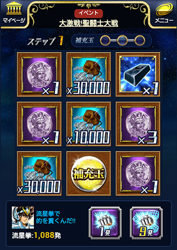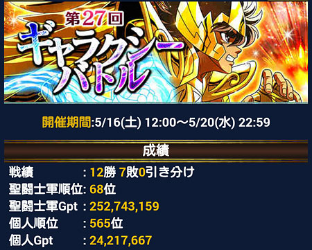 聖闘士星矢 ギャラクシーカードバトル(106) 今月もGBが無事終了致しました。今回は数人抜けたので、もっと順位下がるかと思ったんですが・・・思ったよりも良い成績だと思います。12勝出来たのもウレシイね。自分用修復300以上溜まっていたので、久しぶりにG凸圏内に入りました。実弾もちょっと使ったけど、毎回これくらいの消費数だったら助かるんですがね。G凸もっと欲しいなぁ〜。次回に向けて、また自分用修復貯めよう〜っと。 GBが終わって、また聖闘士大戦が始まりました。毎回毎回、試練やるの面倒だから今回も適当にやろうと思っていたら、懐かしの『的当て』が、当イベントで復活ということで、ちょっと気力が湧いてきましたw考えましたなぁ、運営さん。んで、頑張って1000発以上溜めてチャレンジしてみたんですが・・・やっぱそう簡単にUR穫らせてくれないか・・・全部クリアするとG凸なんだけどなぁ。ま、やれるところまで頑張ってみようと思います。 [0回]PR