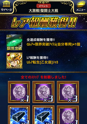 聖闘士星矢 ギャラクシーカードバトル(107) モバ星を初めてから、660日経過しました。 前回のイベの結果発表。新メンさんの活躍が凄くて、いつもより軍位が上がっております。この勢いで行くと、GB以外でもトロフィー取れるんじゃね?!…とか思ってみたり。 的当ては無事、全クリしてG凸ゲットできました♪♪♪途中、流星拳集めるの苦行になっておりましたが、諦めなくてヨカッタw そして、新イベのガチャでは、LEミロ様がついに登場!しかもコスモ22から23にアップとな。生き急いでますね、運営さん・・・ そして、ついに登場!URフレアさん!!これを待っていたのよ!!ガチャでしか出ないみたいなので、バザーで買う予定です。そして、防御デッキ、海からアスガルドに戻そうw 新イベの上位報酬はGR氷河さん。青銅氷河さんの新柄ついにキターと思ったら、今流行の激突(横向き)シリーズなのですねwステ値は良いから、バザーで安かったら欲しいなぁ〜〜〜♡ [0回]PR