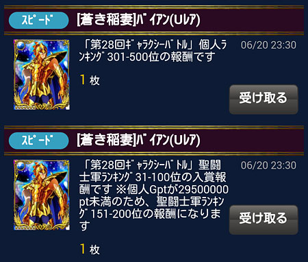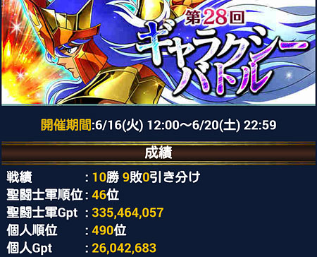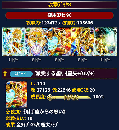 聖闘士星矢 ギャラクシーカードバトル(110) GBお疲れさまでした。みんなの力で軍トロフィーをゲットすることが出来ました。最終戦は・・・ 大接戦だったし(負けたけど)、濃厚な5日間でした。 私も久々にUR覚醒圏内に入ることが出来ました。今回は報酬が海祭りだったのよね・・・自分デッキで使えそうなのないけどね(爆 GB中に、激突星矢が解禁になったので、GR星矢を買い替えました。こっちの星矢の方が、強いしカッコいいしw即戦力になって貰いたかったから思い切って技10買いました。修復170個・・・そして最終戦での大量消費・・・これはもう、今、バザーに出してるの売れて貰わないと困るなぁw修復貧乏再び・・・ [0回]PR