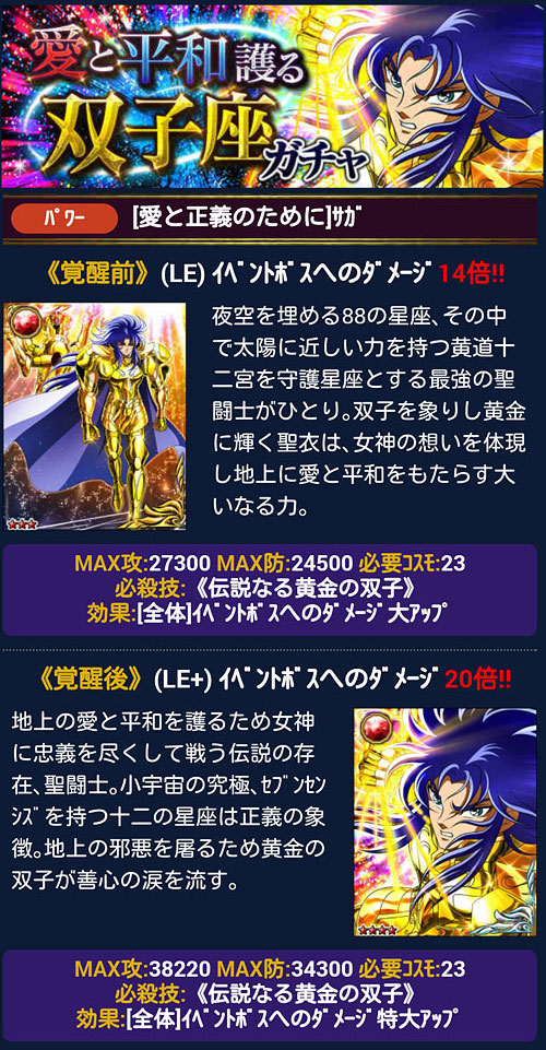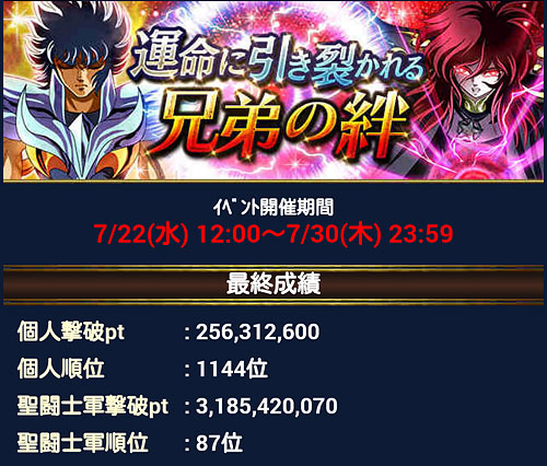 聖闘士星矢 ギャラクシーカードバトル(115) まずは前回のイベの結果発表。軍玉復活ってことで、序盤は不具合のお知らせ出まくりでワロタ&呆れたw自分用修復使いたくないのに、接戦だと、つい使ってしまいますね。罠ですね。 さて、今週の黄金魂がサガ回なのですが、現在行われてるイベ&ガチャもサガ回です。偶然かな?それともこっそり連動してんのかな?w そして、Gアテナで出て来る、イベの特攻レアが一輝兄さんだったのですが、よく見たら6月のイベでも特攻だったらしくプレゼントBOXの中に大量に眠っておりましたw ラッキー♪と思って大量生産したら・・・何となく今週の銀魂(星矢パロ)を思い出した。「それはお前だーー!(CV.杉田さん)」って声が聴こえてきそうですw [0回]PR