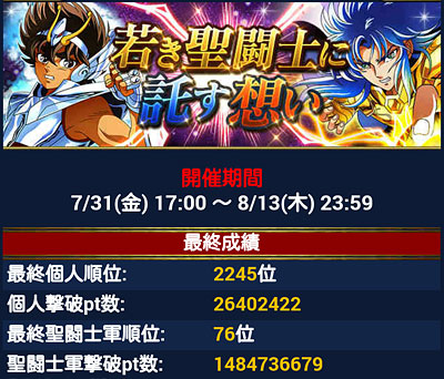 聖闘士星矢 ギャラクシーカードバトル(116) 前回のイベの結果発表。毎度の事ですが、後半は完全にサボってましたね。。。 今月のGBの報酬・・・ついに原作カラーが登場。これで、無かったことにされてる天界編序章のカードまで出て来たら、グリーと同じ道辿ってるので、このゲーム終わる気がするorzてか、アニメの作画で金髪ミロ様・・・なんかチャラいww 似合わないなぁwwアニメだと金髪というより、ただの黄色だからなぁ・・・微妙な色合いが出せないので・・・やっぱりアニメは髪色変えて正解だったんや・・・。*** 先日、ログインルーレットで『S』が出ました♪てか、最近『A』とか『B』ちょいちょい当るんですよね。イベサボってると『S』まで行かなくても『A』とか『B』とか出易い気がしますww [0回]PR