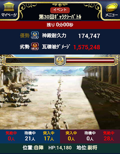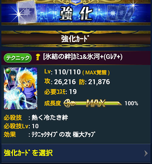 聖闘士星矢 ギャラクシーカードバトル(117) やっと、このカードも技10になりました。他にもドンドン上げて行きたいんですけどねぇ・・・もう餌が無いorz 丁度GB終了時に更新したら、こんなスクショが撮れましたw自軍が勝ってるのに壊れてるw [0回]PR