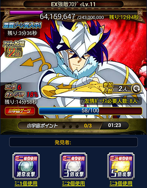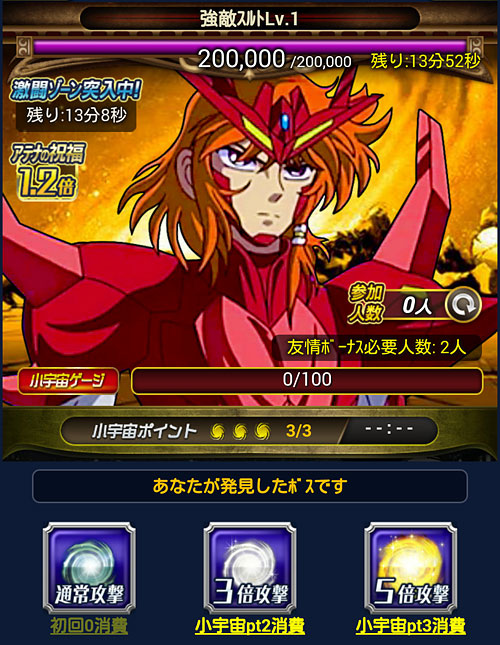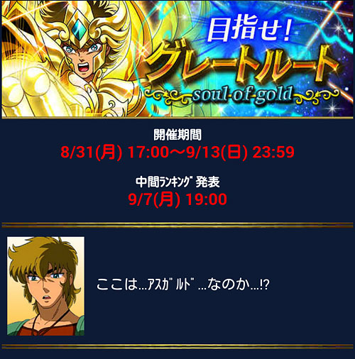 聖闘士星矢 ギャラクシーカードバトル(121) 最後の個玉イベは『黄金魂』。てか、黄金魂ネタ解禁するなら、もうちょっと・・・せめて年内は運営続けて欲しかった。黄金魂のアニメと同時にモバ星も終了とか、寂しいよぉ。まぁ、決まっちゃったことは、仕方ないけどサ。 今回のガチャ(無料)&イベ報酬で手に入る新規カードたち。ちゃんと神闘士までいるじゃないの〜。他の黄金聖闘士&神闘士は追加ガチャか、次イベの報酬かな?LEガチャは結局、黄金全員揃わないまま終了になってしまったので、せめてこっちは全員揃えて欲しいねぇ。連携とかあるのかなぁ? ちなみに、未覚醒アイオリアのモーションはこんな感じです。力尽きて倒れてます。こんな所までアニメ再現しなくてもww酷いwww ちなみに、イベントボスはこんな感じです。作画酷いww黄金魂のアニメで、もっと良い作画あっただろうwwてか、カード描き下ろしなんだからソレ使えば良いのに・・・このチョイスは悪意を感じるww [0回]PR