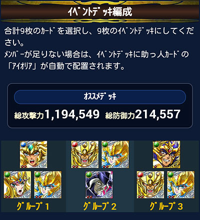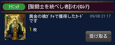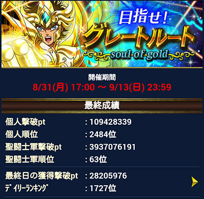 聖闘士星矢 ギャラクシーカードバトル(123) 最後の個玉イベの結果発表。 最後のイベントデッキはこんな感じでした。もう要らん!っていうくらい特攻GRが出てくれましたww エンディング、気付いたらミロが主人公になっていたwアニメ通りに作ってあるだけなんですけどね。この終わり方で来たのは、次のガチャの目玉が、このお方ってのもあるかもしれない。 そうそう、黄金聖闘士たちと強力な連携を発動する教皇シオン様のカード。 中盤辺りで、ガチャから出てくれました♪なので片割れ買って覚醒させたら、後日またガチャから出て来たという・・・(苦笑GBが終わる頃には、かなり安くなってしまいましたが、やっぱ一度は持ちたいこのカード♪ 覚醒前のモーション。 覚醒後のモーション。絵柄がオリジナルでカッコ良いカードですが、モーションもカッコ良かった♪ [0回]PR