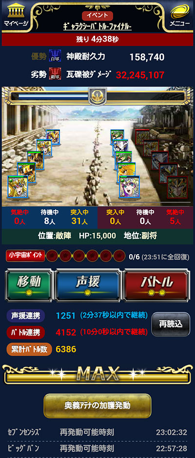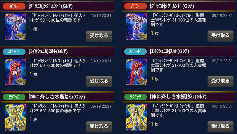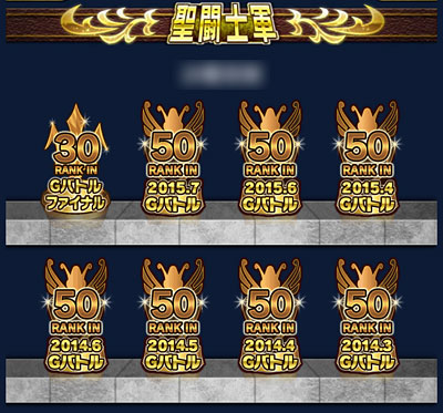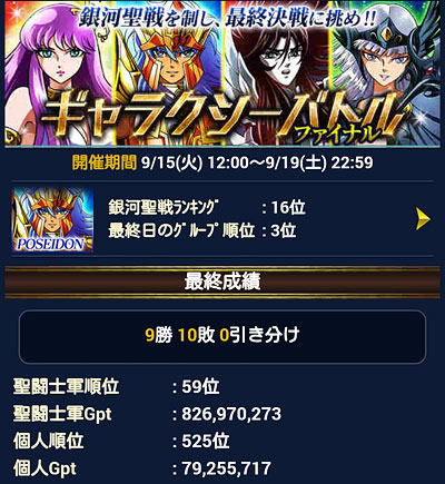 聖闘士星矢 ギャラクシーカードバトル(125) GBファイナル、これにて終了。 もう、試合時間に合わせてINしたり、セブンセンシズを発動することも無いんですねぇ。 最後の結果は、こうなりました。軍内では3位でした。手持ちの修復を殆ど注ぎ込んだので、稼いだ稼いだ♪ おかげさまで、全ての報酬GR覚醒出来ました♪ 我が軍が獲得したトロフィーは、全部で8つになりました。副将、そして、大将不在時の指揮官としては、いろいろ不慣れで未熟でご迷惑をお掛けしたかと思いますが、用兵術を伝授してくれた師匠や優しい軍メンの皆さんのお陰で、最後の最後まで楽しくGB出来ました。ということで、これまで、我が軍に関わってくれた全ての人達に感謝。 [0回]PR