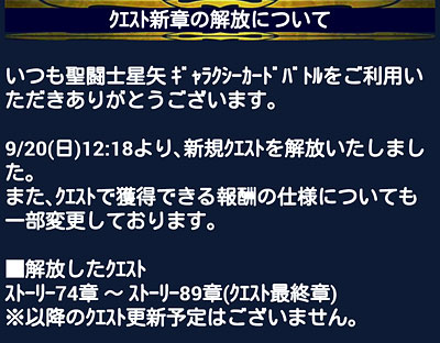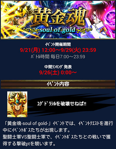 聖闘士星矢 ギャラクシーカードバトル(127) 通常クエストの新章が解放されました。今日はミニ回復の制限が無いのでチマチマ進めていたんですが、指が痛くなってきたので断念しましたw 明日から最後のイベントが始まります。 ってことで、ガチャにアイオロスと童虎が追加。ガチャチケ溜め込んでいるので、あとで引いてみます。 そして、報酬に・・・オデン・アイオリアが来ちゃったwアンドレアス様は覚醒前の方が良いなぁ。神闘士2人は覚醒後がステキ。そして、シュラ・・・うん、やっぱモバ星の絵師さんは上手いね。黄金魂の作画が残念過ぎて・・・彼のこの切れ長な目つきを研究して貰いたいものだ。 [0回]PR