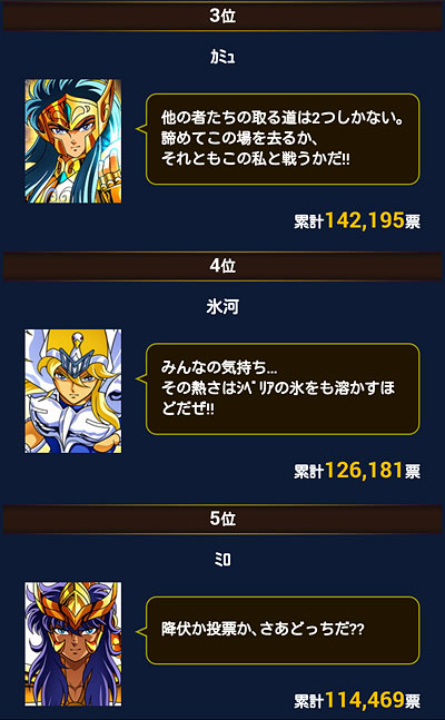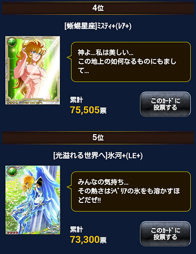 聖闘士星矢 ギャラクシーカードバトル(130) ついに、抜かれてしまったwww神氷河様より、ミスティの方が美しい・・・だと!?w そして、辰巳も順位を上げてきておりますww ちなみにキャラ別は、私得トリオが並んでおります♪ [0回]PR