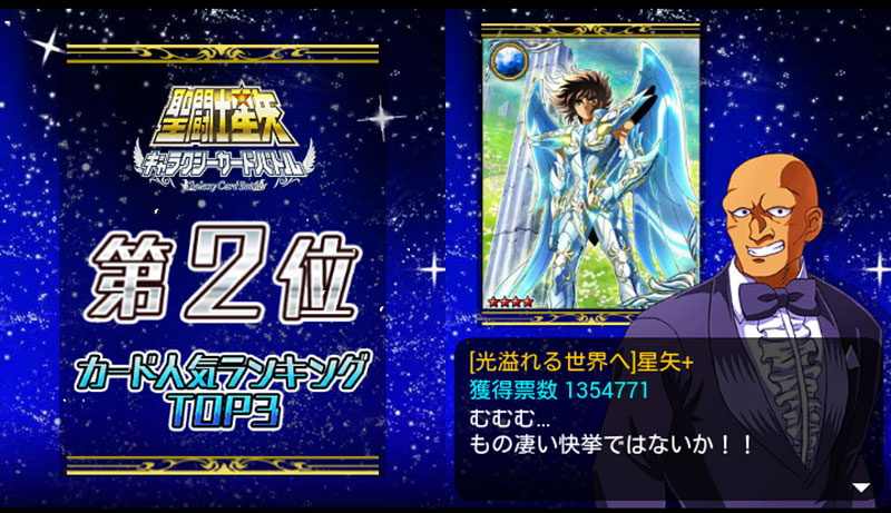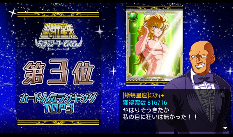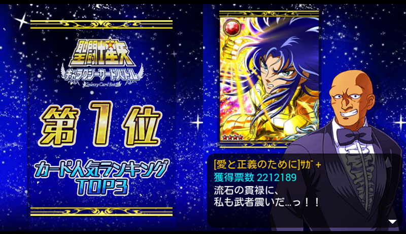 聖闘士星矢 ギャラクシーカードバトル(132) カード人気投票の結果発表〜〜! 第三位は、ミスティ!ってマジかwww 第二位は、LE星矢!途中結果では1位だったのですが・・・ そして、第一位は、LEサガ!やっぱ、サガは強いねぇ。黄金魂のTwitter人気投票でも1位だったし。そして、4位以下はご覧の通り。(全部は無理なのでTOP10まで) 辰巳も頑張ってるなぁwwそして、LE氷河様は6位でした。星矢の初代中の人、古谷さんも言ってたけどね、氷河はマザコンだけど技が美しいんだよねぇ。それがカードにも表れてるといいますか。他にも美麗カード多いもんね。白鳥の王子様、モバ星界でも結構人気があったようで嬉しいです♪ちなみに、キャラ別(カード総合)順位は以下の通り。(これも全部は無理なのでTOP10のみで) 氷河さん、総合3位で大健闘です!こういうのは、やはりカード数が多いキャラが有利なのかな。そう考えると、ほぼ1枚の投票数で稼いだミスティと辰巳も凄いなwところで、3位以内に入るとキャラの台詞変わるんですね、マーマ… [0回]PR