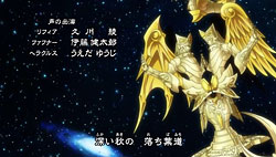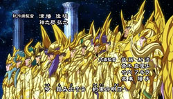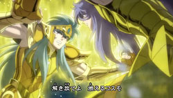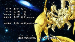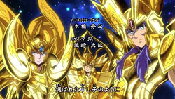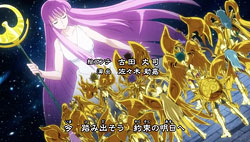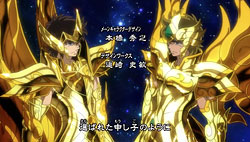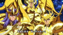 【アニメ】聖闘士星矢 黄金魂 OP&ED 聖闘士星矢 黄金魂 第二話から正式にOP&EDが付いたということで、まずはそちらの感想から。■オープニング「聖闘士神話」歌:ROOT FIVE 出だしから旧作オマージュですよ。完全に旧作ファン向けですよ。こういうノリ、好きですwこれで、歌も本家だったらヨカッタのに・・・ 某OPに似てると話題のこのシーン・・・てか、この流れ、旧作での氷河・フレア・ハーゲンのポジションにしか感じられないんですがwそういう事なんですかね・・・友達以上恋人未満でお願いしますね(苦笑 第三話では、ミロとカミュが喧嘩するみたいですが・・・?うわぁぁ、このシーンめっちゃ気になるぅぅぅ〜!どんな形であれ、二人が直接関わってる描写を入れてくれるのは嬉しいです。今後の展開に目が離せません。そして・・・またアテナエクスクラーメーションやっちゃうの?wwΩみたいな安売りはしないでくださいね・・・大技放っておいて倒せませんでしたーとか嫌ですよ・・・(苦笑 二話に出て来た神闘士が完全に悪人面だったので、今回の敵はイケメン少ないのかな?聖闘士星矢の世界では、敵もイケメン多かったから、残りの枠はイケメンが良いなぁ(爆 全員の神聖衣のお披露目キター!…とその前に、ミロ様の作画何とかしろ(爆カミュは天女様みたいになっちょる♪(〃∇〃)肩パーツが二重になってるのLoSっぽくてイイ♪そしてシュラは原作基準のマスクになってる!GJ! サガのバケツがパワーアップしてるwww ある意味これもLoSっぽいww結構デザイン影響受けてるのかしら・・・てか、デッちゃんも背中に背負ってるモノそれで良いのかwww アイオロス兄さんは元々翼が付いてたので、あまり変化感じられませんね・・・(^o^;)■エンディング「約束の明日へ」歌:ROOT FIVE エンディングはオブジェクト形態のお披露目会でした。あ、ちなみに曲は良いと思います。やっぱ彼らは下手にカヴァーするよりオリジナル曲で勝負した方が良いと思うんだな。。。双子座は天使と悪魔の翼になってるんですね。基本的に、オブジェクト形態はどの聖衣もカッコイイと思うんですよ。てか、乙女座のオブジェクト形態がカッコ良過ぎてだなw魂キャラバンでマイスEX見たけど、オブジェクト形態で飾って拝みたくなるレベルw ミロ様は蠍の爪を背負うことになるんだよね・・・?どうなんだろうなぁ、コレ。オブジェクト形態はカッコイイけど。マイスにしても、全体図を見てみない事には何とも言えないデザイン。それに比べて水瓶座は、素敵度アップですなぁ。多分、マイス買うとしたら我が師になりそう・・・w 横一列に集合すると、すごいゴチャゴチャしちゃいますねw後ろ姿は・・・やっぱりカミュ様が天女様で素敵だぁ(爆大人になったGA氷河ちゃんに着せたくなった(爆 [0回]PR