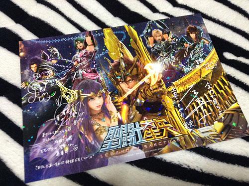 聖闘士星矢 LoS 感想(3回目) 星矢LoS、3回目の鑑賞に行ってきました。流石に3回目ともなると、気持ち的に余裕が出てきますね。そして、欲がいろいろ出て来るw最初に感じた「よく90分でまとめたな」って気持ちは変わらないんですが、もっと青銅ちゃんのエピソードが観たいとか、もっと黄金の活躍が観たいとか・・・サガ様の美顔をもっと拝みたかった!とか(笑ってことで、円盤出る時に特典映像とか付かないかな?(笑車田先生も言ってたけど、LoS版のキャラでオリジナル観たいね〜。ポセイドン編も良いんだけど、もっとあの青銅ちゃんたちの絡みが観たいのよ。もう、エンドロールの後のシーンが好き過ぎて・・・とにかく可愛いのよw原作・アニメファンとしては、氷河が残念なイケメンじゃないとか、瞬がナヨナヨしてないとか、いろいろ思う事はあるんだけど、LoS版の青銅ちゃん、これはこれで、キャラのバランスが上手く取れてるな、と思ったからアリだと思った。私的にLoSは派生作品の一環だと思ってるからさ、今後も車田版の星矢、荒木版の星矢、そしてLoS版の星矢、それぞれで上手く続いて行って欲しいと思ってます。んで、今日は特に氷河さんを観察していたけど(笑)、LoS版の氷河さんは、ホントにキザですね。所々でクールにカッコ付けてる。でも子供の頃に抱いていた氷河の印象って、実はこっちの方が近いんだよなぁ(笑それが今では「マーマでおまるな、残念なイケメンの氷河さんが好き!」\(*^o^*)/って、どこで道を間違えたんだかwwLoS版の氷河さんはキザだけど、星矢に踏み台にされたり(笑)、デスマスクの登場に引いてる表情とか、お誕生日会での笑顔とか、そういうところが何だか普段の態度とギャップを感じて可愛らしい。LoS版の氷河さんの魅力はそこかな。DVD出たら所々、一時停止して観察したいです(笑) 入場者特典3周目、キャストのサイン&メッセージ入りポストカード。小野氷河さんのメッセージ「君にダイヤモンドダスト!!」ってww [1回]