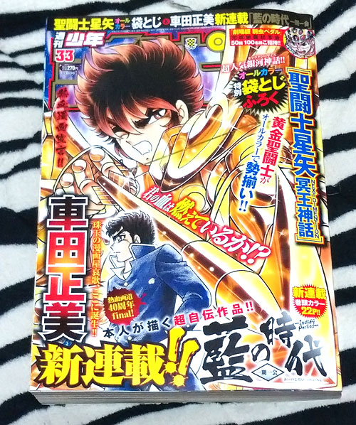 週刊少年チャンピオン 2015年No.33 ●聖闘士星矢 NEXT DIMENSION 冥王神話(特別ふろく袋とじ8P)「神々の迷宮」に囚われた沙織とシジマ。 脱出を試みた二人の前に現れたのは かつての黄金聖闘士たちだった!!●藍の時代-一期一会-(車田正美、新連載)さかのぼること40年以上。 秀才には、程遠く不良にもなり切れない少年は、少年漫画に将来の希望を見出した!! 実話を元に超展開する一期一会の物語!!・・・ということで、発売日の朝にコンビニで購入。表紙、週刊少年チャンピオンの文字が見えてないって凄いねww久々のNDは、袋とじ8P。完全に黄金魂の宣伝ですね。無印の黄金聖闘士たちが集結してるんですが、みんなアニメカラーになってました。自分もアニメから入ってるので、髪色を統一するのであれば、それはそれで良いんですが・・・。瞬や沙織さんの髪色は茶髪のままだし、原作カラーに拘り持ってるファンも居るので複雑ですwマイスやゲームDLCの原作カラー商品展開は何だったのか・・・って事になりそうで(苦笑てか、アニメ版のミロ様のマイスが手に入らないから、原作カラー版予約しちゃったんだよ〜!wまぁ、黄金聖闘士たちの髪色よりも、私はこっちの方が気になりますけどね・・・↓ アテナが「むううっ」って・・・wwwシャイナさんみたいな女聖闘士なら気にならないと思うけど、沙織さんが言うと違和感ありますwNDの正式な再開時期は秋だそうで。それまで、車田先生の超自伝と黄金魂を楽しんでくれ、ってことのようです。車田先生の超自伝は、普通に面白そうなので、暫くチャンピオン買おうかなぁ。 [0回]PR